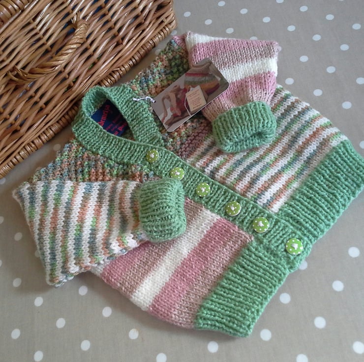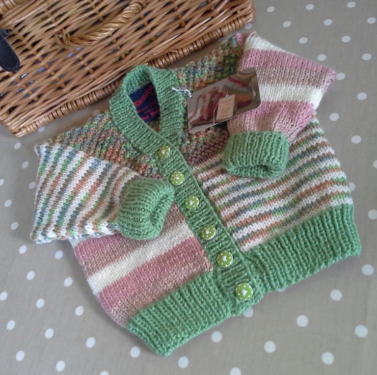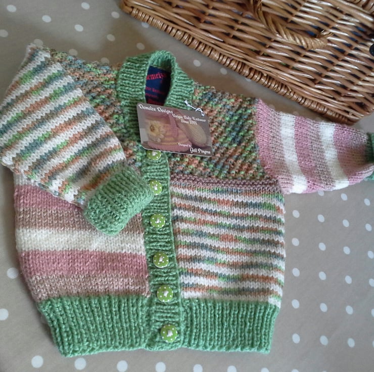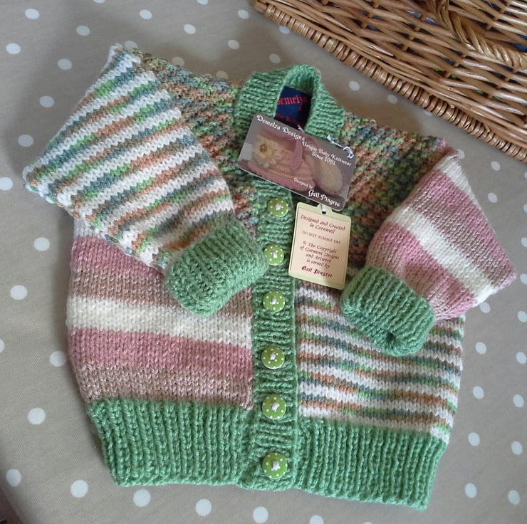 A very unique baby cardigan designed and hand crafted using quality branded machine washable British and French manufactured yarns. I have designed this product for either sex babies, especially if gifting for the first born within a family network. The cardigan has the designer garment label attached to the back neck edge with the care instructions woven within it for lasting reference and as proof of it's origins. The buttons are made from genuine wood with a polkadot deign on them.