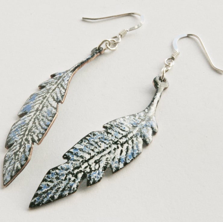 I hand cut these copper feather earring shapes, so you can be sure this a design uniquely available from me. The earrings are enamelled and kiln-fired in several layers, and on the front and back. I have chosen two colour ways to make them in, a subtle blue/grey with black and a pale brown/grey with black. The enamel on the reverse gives this jewellery both strength and resilience. They hang from silver fish hook earwires. The Feather earrings are sent packaged in a gift box inside an outer packaging box by 'Tracked' Royal Mail postage.