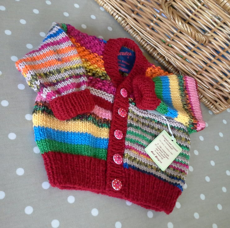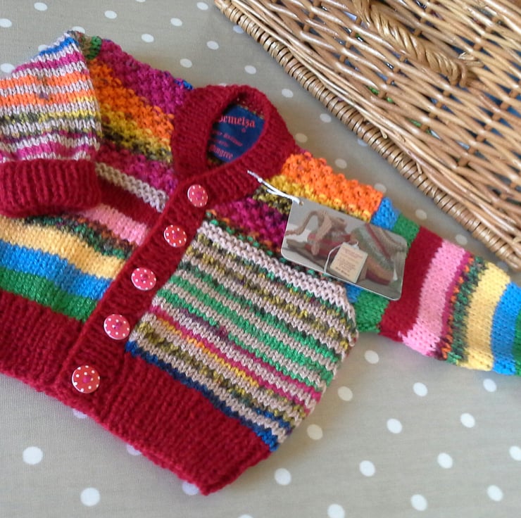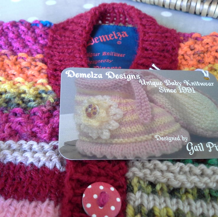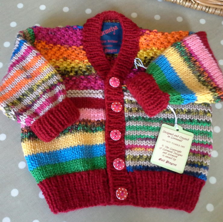 A very unique eye catching baby cardigan designed and hand crafted using quality branded machine washable British and French manufactured yarns. The buttons are made from genuine wood with a delicate polkadot design on them. The garment has the designer label attached to the back neck edge with the care instructions woven on the reverse side for lasting reference and as proof of it's origins.