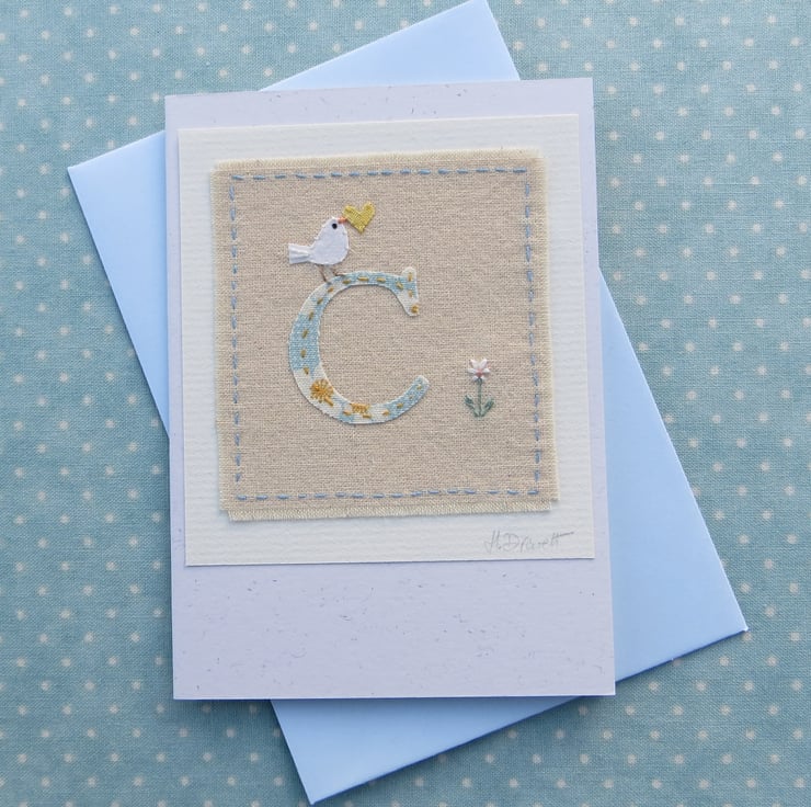 A hand-stitched card with the letter 'C' cut from pretty cotton fabric stitched into place with tiny stitches. I have added a miniature applique dove with heart in her beak, and then embroidered a tiny daisy flower to complete the design. There is room under the mounted textile to write an inscription, for instance: C is for Charlie or any wording of your choice, just let me know.