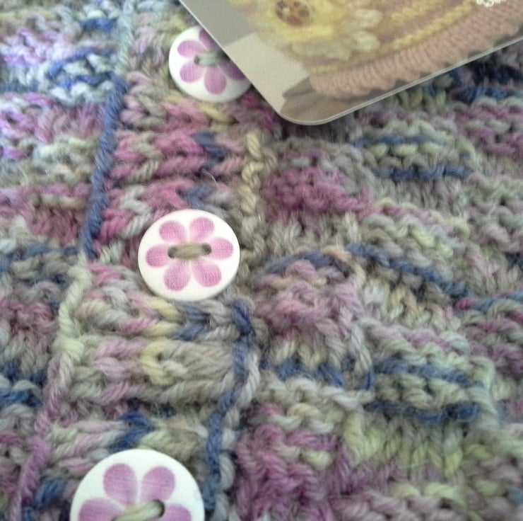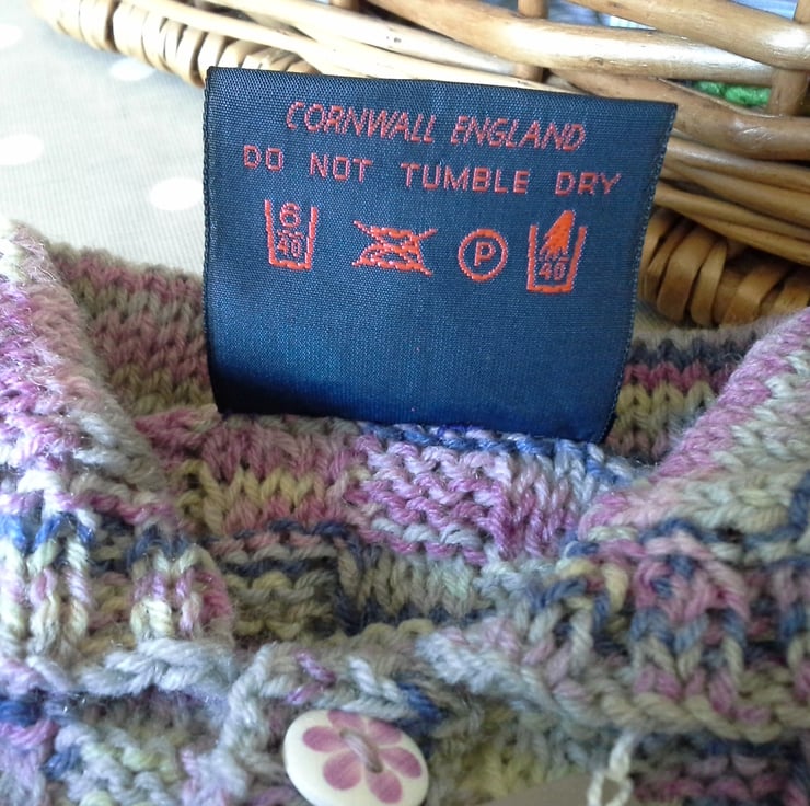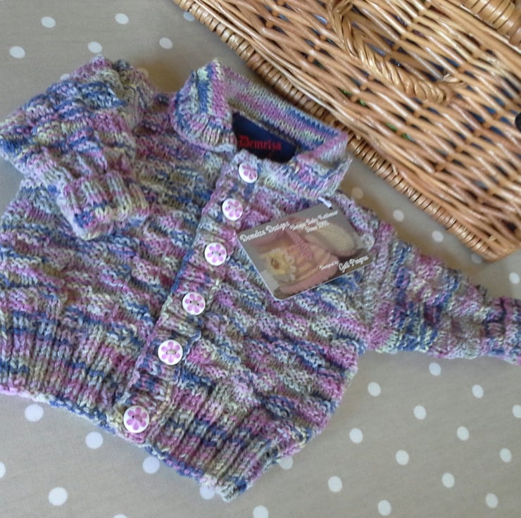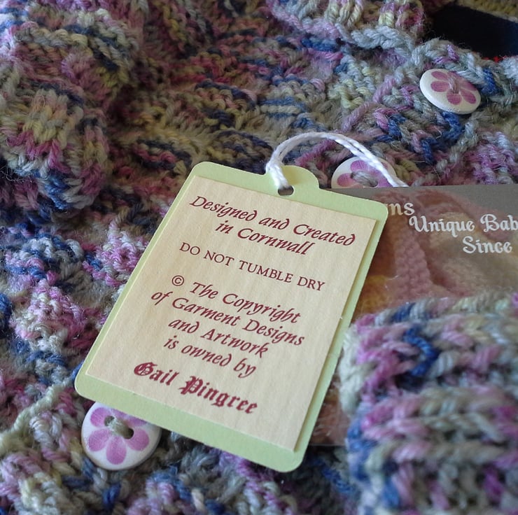 A unique baby girl's hand knitted cardigan designed and made in Cornwall using quality branded soft machine washable yarns. The yarn has a luxery content of 35% Marino Wool for added warmth with a 75% quality acrylic mix for practical everyday washing. The buttons are made from genuine wood with a delicate flower design on them. The cardigan also has the luxury satin woven Demelza Designs garment label attached to the back neck edge with the care instructions woven on the reverse side for lasting reference and as proof of it's origins if gifting. The Demelza garment swing tag will be attached prior to dispatching.