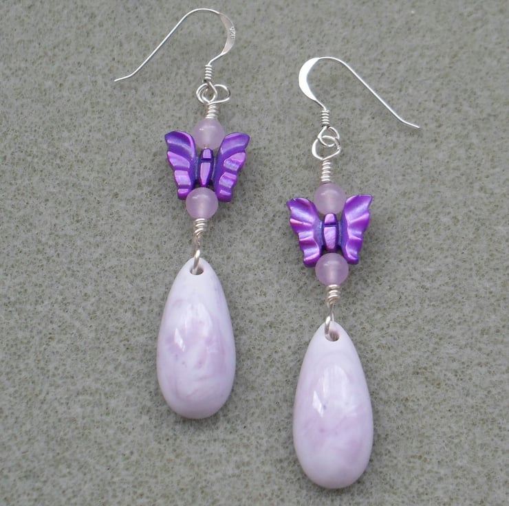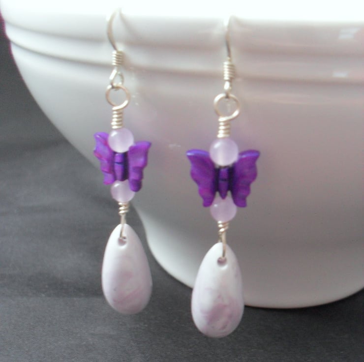 Handmade pear shaped drop resin beads with small lilac quartzite and purple shell butterflies beads have been attached to sterling silver ear wires with silver coloured wire