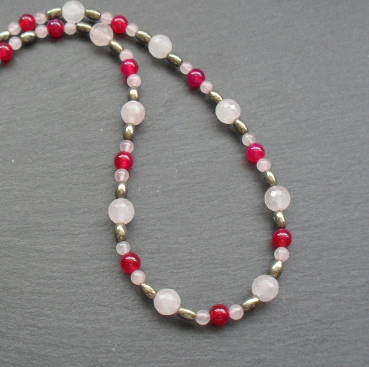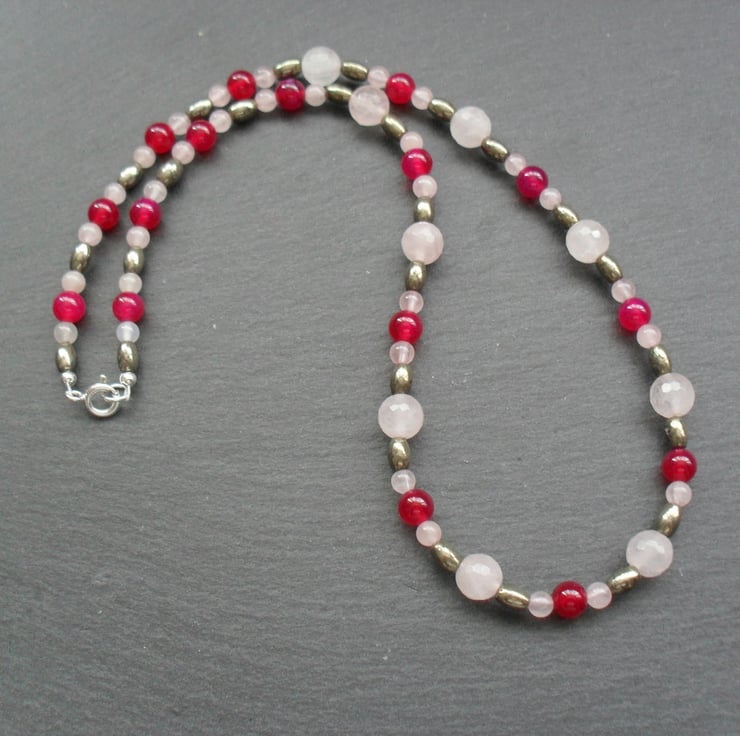 Rose Quartz Pyrite and Agate Semi Precious Gemstone  Necklace