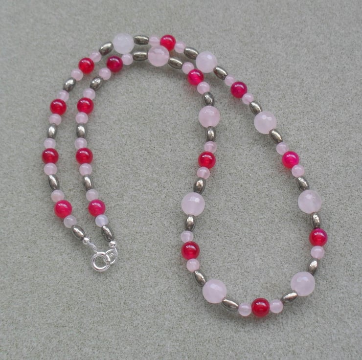 Rose quartz 8 mm faceted beads,pyrite,deep pink agate 6 mm and small rose quartz are attached to a 925 sterling silver bolt ring clasp