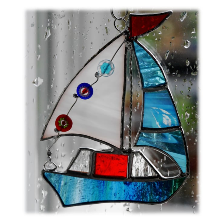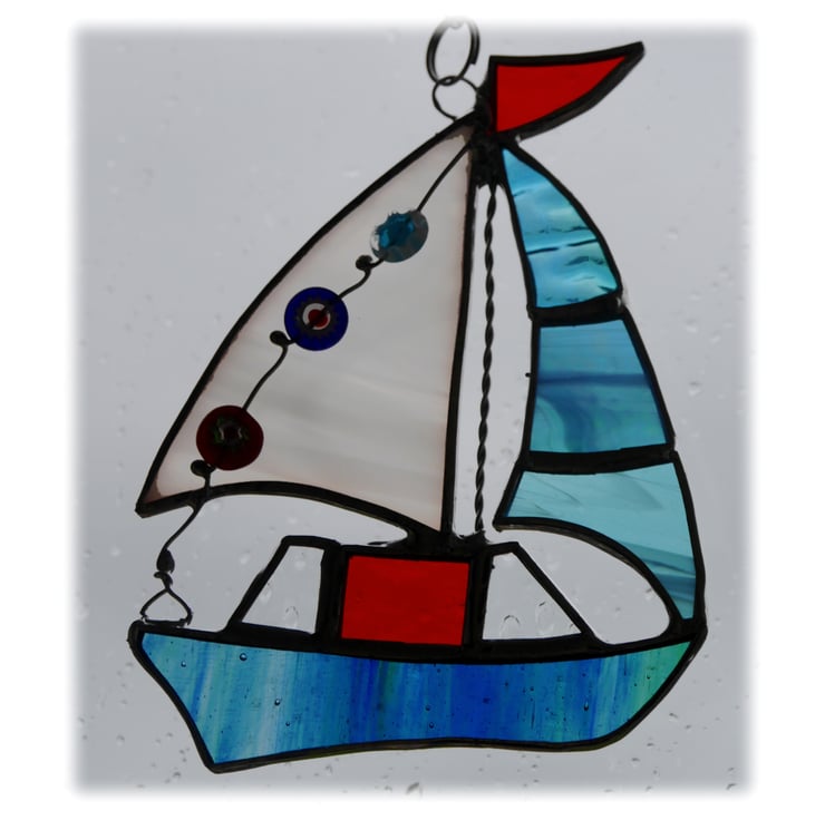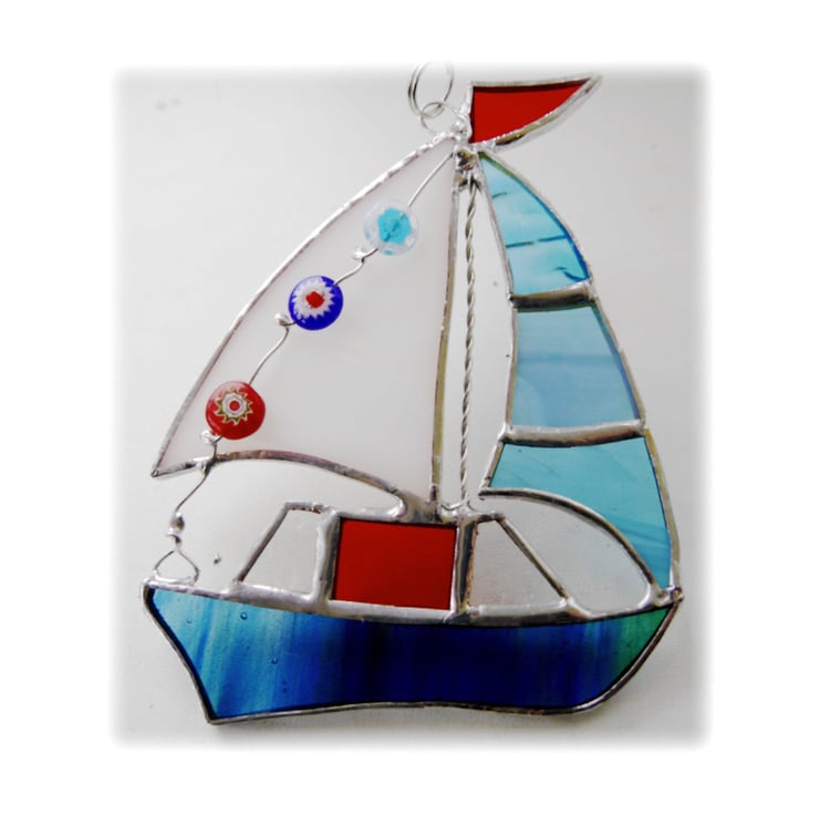 It is a gorgeous little boat with a hull of blue / green glass. It has a little red flag and a red cabin which has clear glass windows, a bright turquoise sail which includes some very shiny iridescent glass and a white streaky sail which is decorated with 3 little beads, as flags, in bright colours to match the boat.