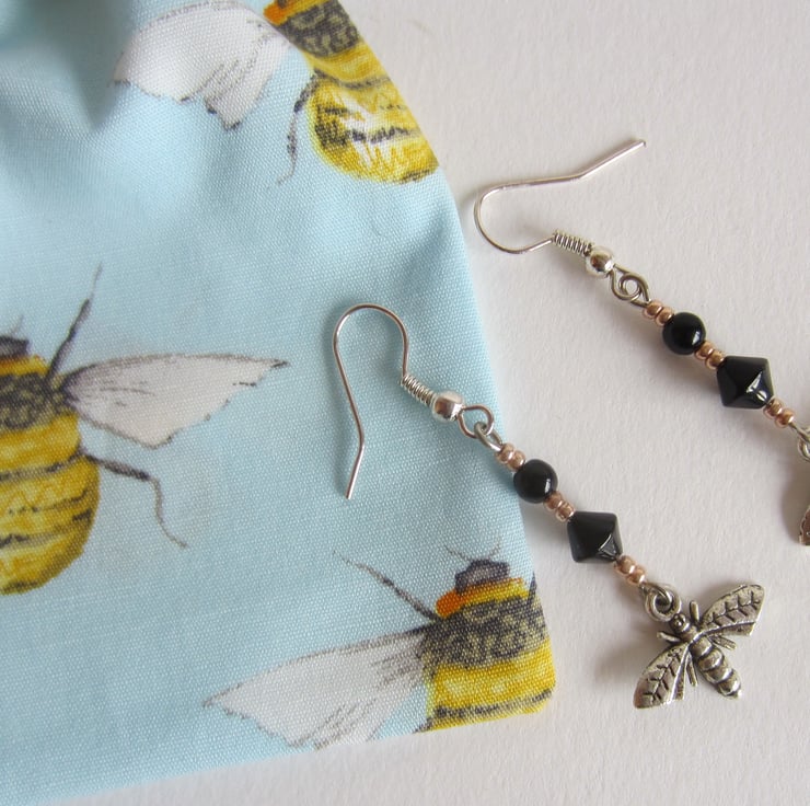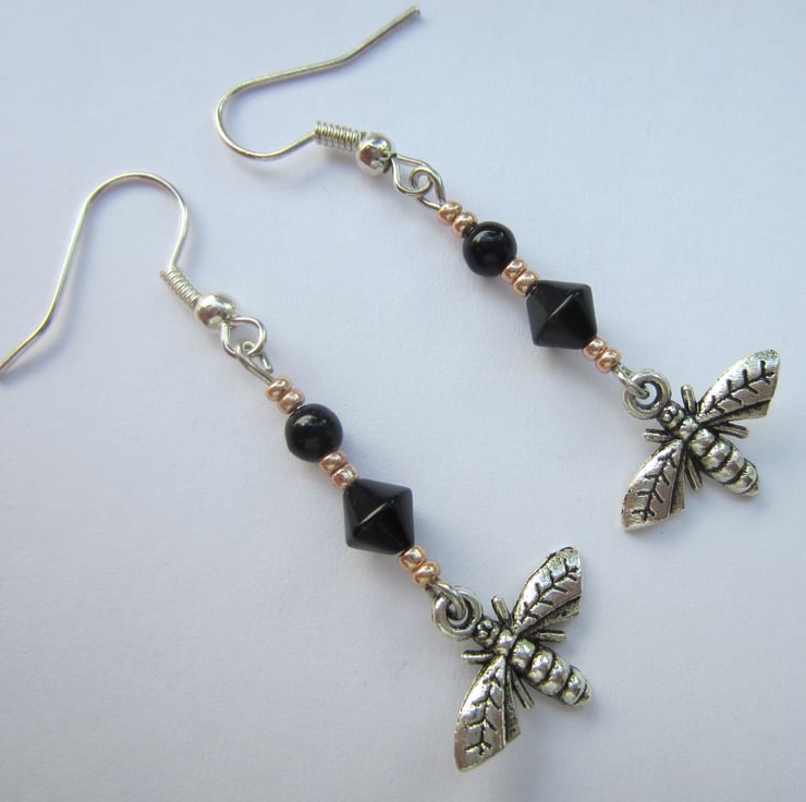 Dangly bee earrings made with silver tone bee charms and copper coloured and black beads on silver plated wires.