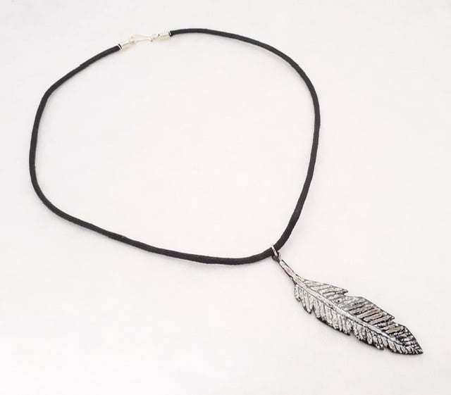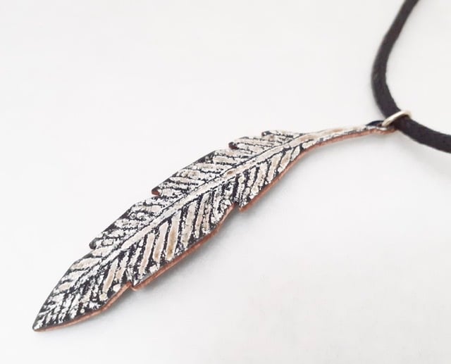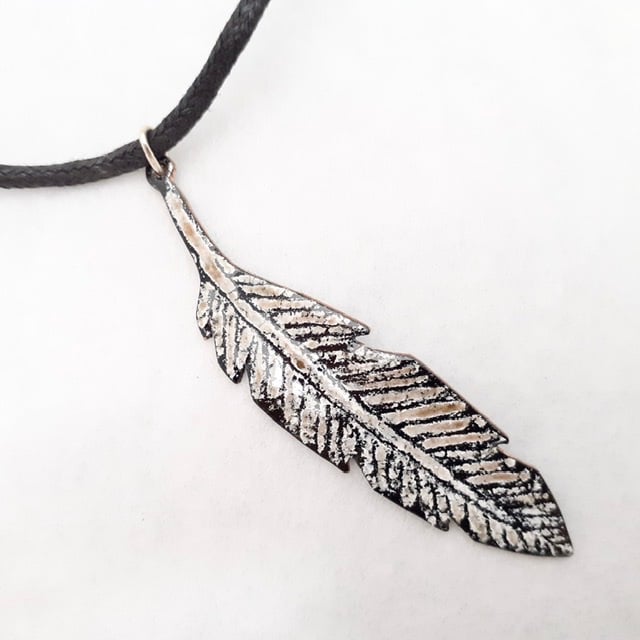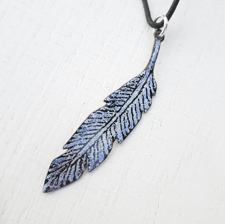 I hand-cut this feather pendant shape in copper, so you can be sure this design is unique to my jewellery. Whatever your style, this subtle Pendant with it’s naturalistic curve will enhance your look on any occasion. It is enamelled in several layers and and on the front and back with kiln firings in between. I have chosen two colour ways to make it in, a subtle blue/grey with black and a pale brown/grey with black. The enamel on the reverse gives this piece of jewellery strength and durability. The feather pendant hangs from a black cord which I offer in a choice of lengths (with a silver-plated fastener). It is presented in a gift box and sent in an outer card packaging box by Royal Mail 'Tracked' delivery.