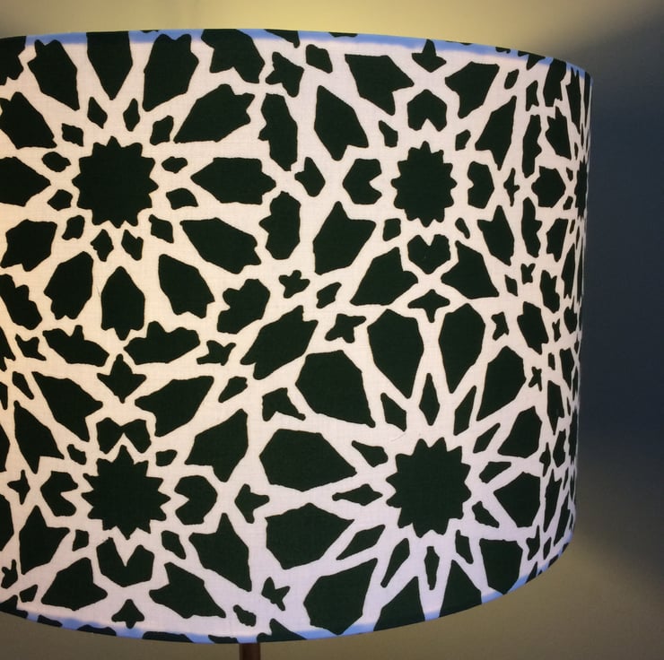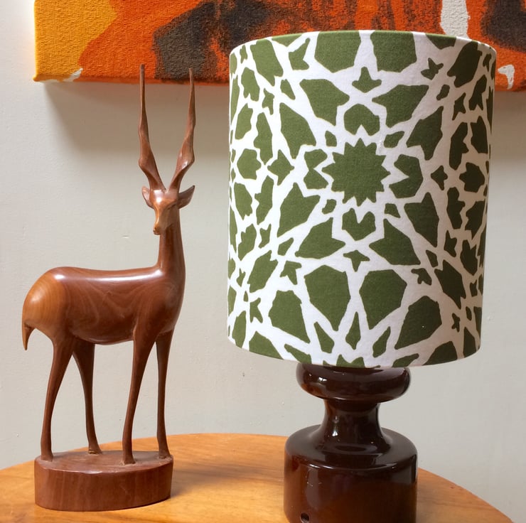 Geometric Pat Albeck Mosaic Osman Vintage Fabric Lampshade option - an ususual fabric for a lampshade in a modern, vintage or retro home. A striking geometric green and white design .
