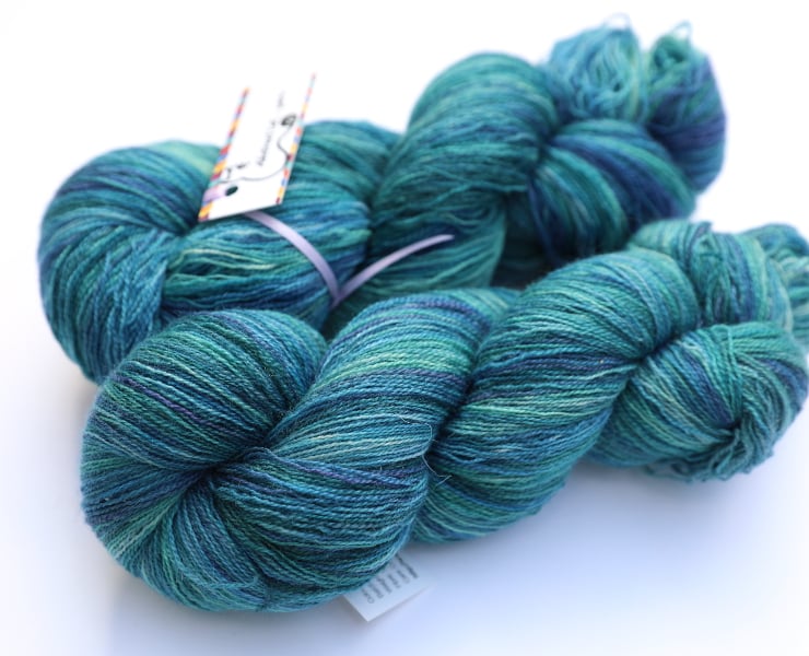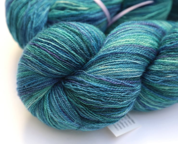Shades of teal green and blue with some lighter sections. This lustrous, lofty, soft yarn should make beautiful lace projects, and these skeins are the superwash version of my regular Bluefaced Leicester laceweight yarn. There is one skein left. Photographs have been taken and edited in bright natural light.