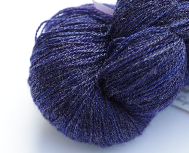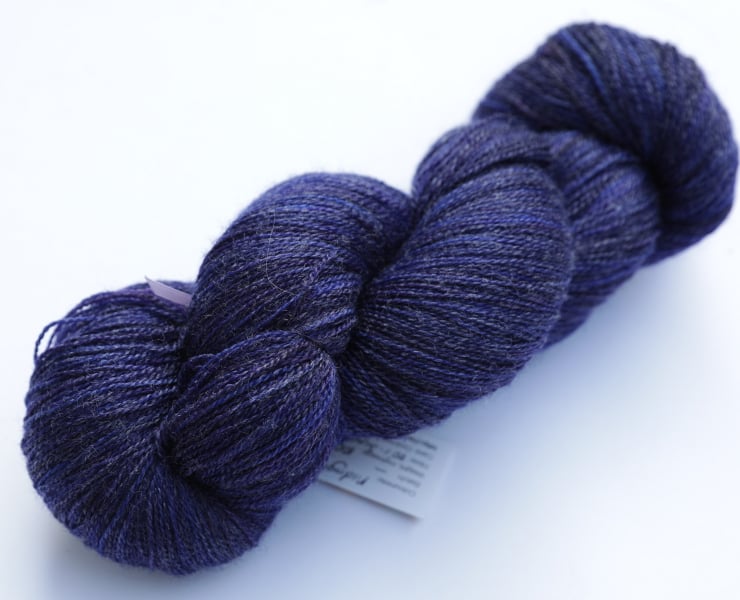 Slightly tonally variegated/semi-solid dark midnight blues. This lustrous, silky-soft, slightly fuzzy yarn with a subtle but almost shimmery sheen should make beautiful lace projects. Photographs have been taken and edited in bright natural light.