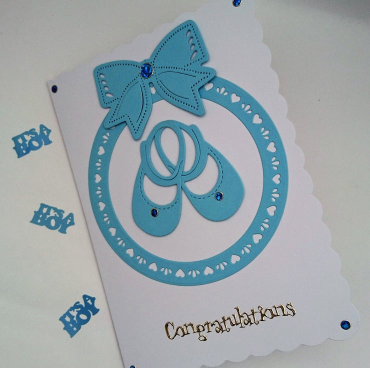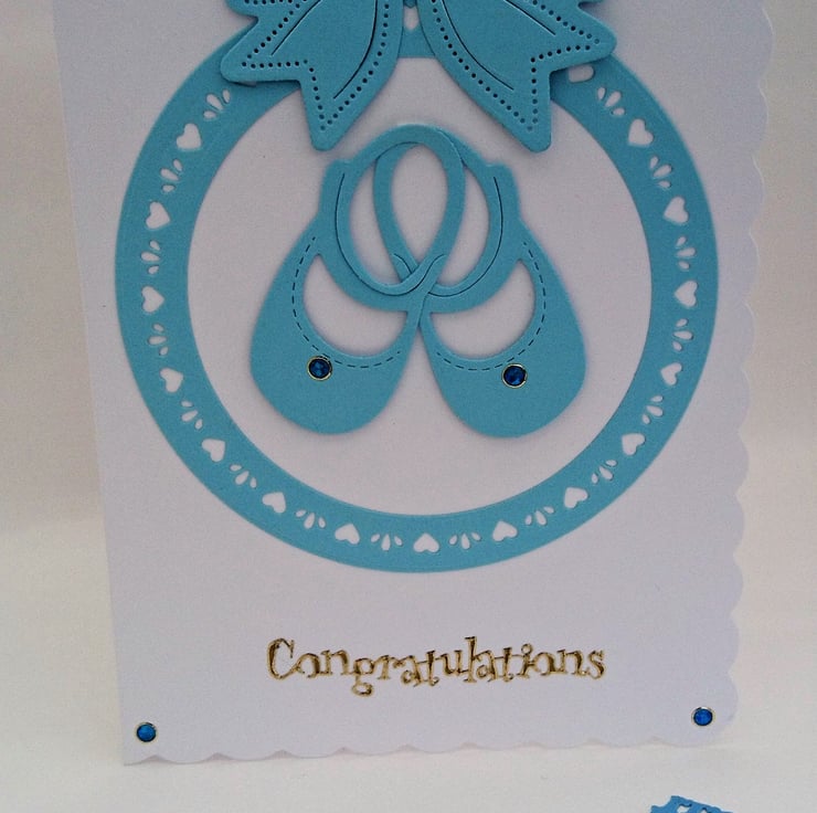 This pretty Blue and White Newborn Baby Boy Keepsake Card has a circle of hearts design with blue baby shoes, blue bow, embellished with blue sparkle dots. Handmade with love, in my wee studio in Argyll, Scotland.