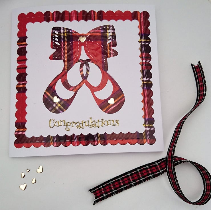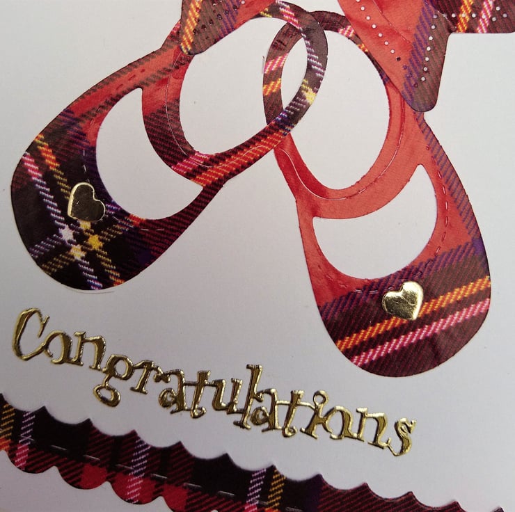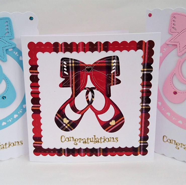 This pretty Tartan and White Newborn Baby Keepsake Card has a Tartan border with Tartan baby shoes, tartan bow, embellished with gold hearts. Handmade with love, in my wee studio in Argyll, Scotland.