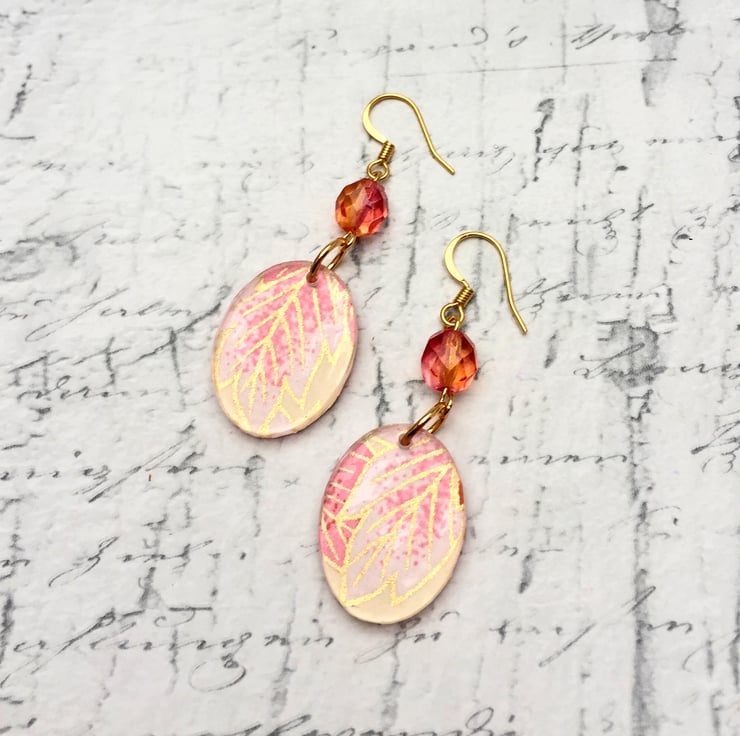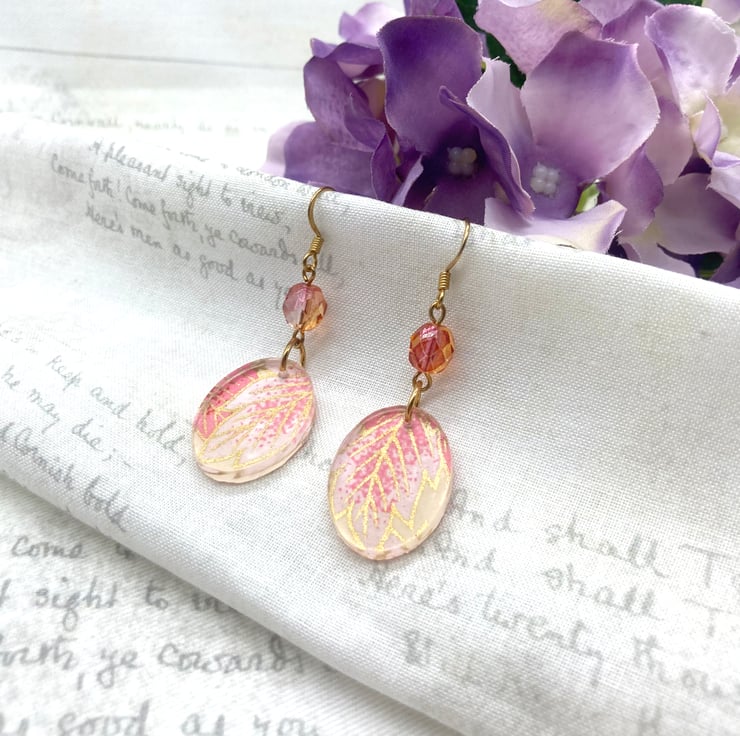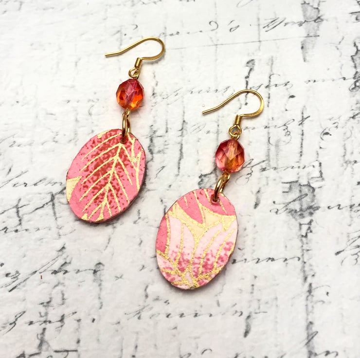 This Japanese Chyogami paper is the star of these handmade earrings (sometimes called Washi Paper). Each colour is screen printed by hand, layer on layer - this particular paper is a leaf print including lovely shades of pink, from cream and pale pink to deep pink and red. The leaves are outlined in the final layer on the paper - metallic gold.