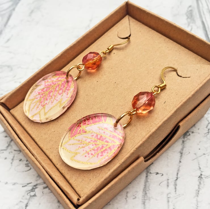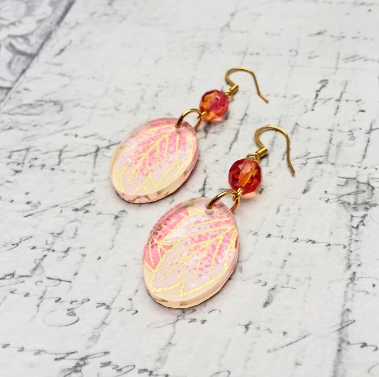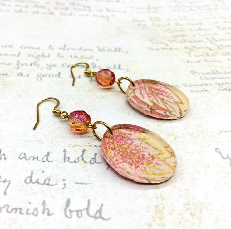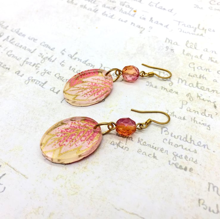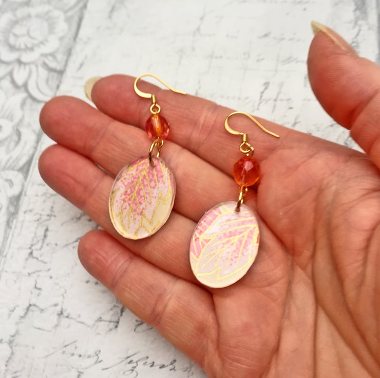 I have used decopage techniques to adhere the paper to oval shaped acrylic tags, adding a different part of the paper to the back and adding layers of acrylic varnish for added protection. These lightweight dangle earrings are approximately 2cm long by approximately 1.5cm wide, with a total drop of around 3cm. I've also added a high quality peach and orange Czech glass faceted bead that sparkles when moved.