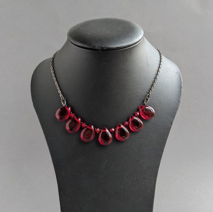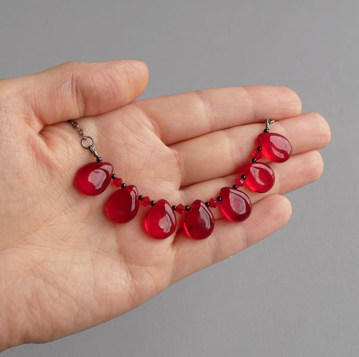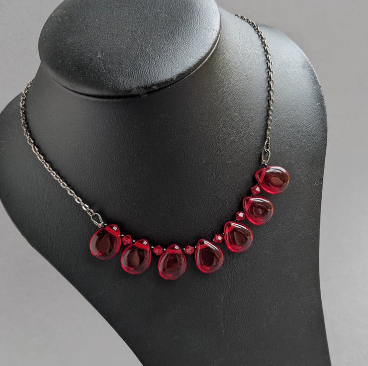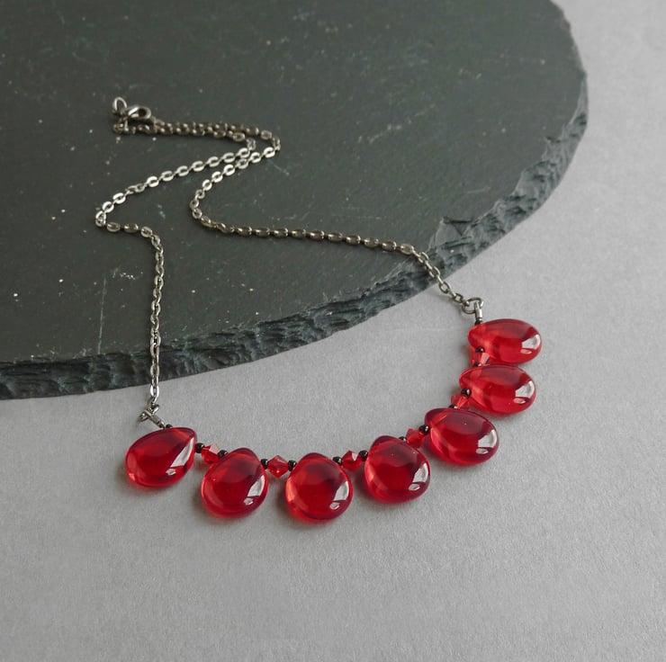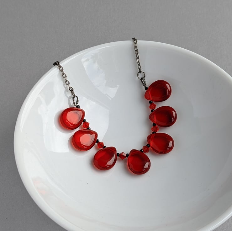 This red and black fan necklace has been made using Czech glass teardrops, which have been accented with glistening crystals. The vibrant colour of this statement necklace allows you to add a pop of colour to your outfit. Each highly polished teardrop is swirled with a mix of red, black, grey and muted green - the photos don't show the true beauty of the glass beads.