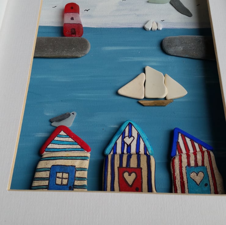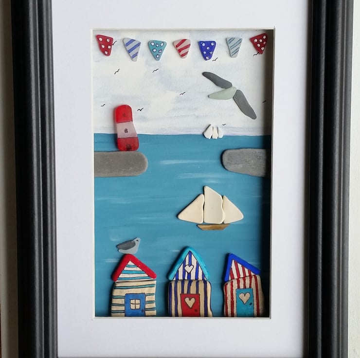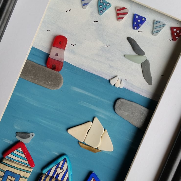A nautical themed coastal scene featuring beach huts, tall ships and a lighthouse created from ocean shaped and smoothed sea pottery along with a string of colourfully painted sea glass bunting all set inside a 35cm x 26cm glazed box frame that comes in black, white and distressed white - just leave a note with your preference when you place your order.