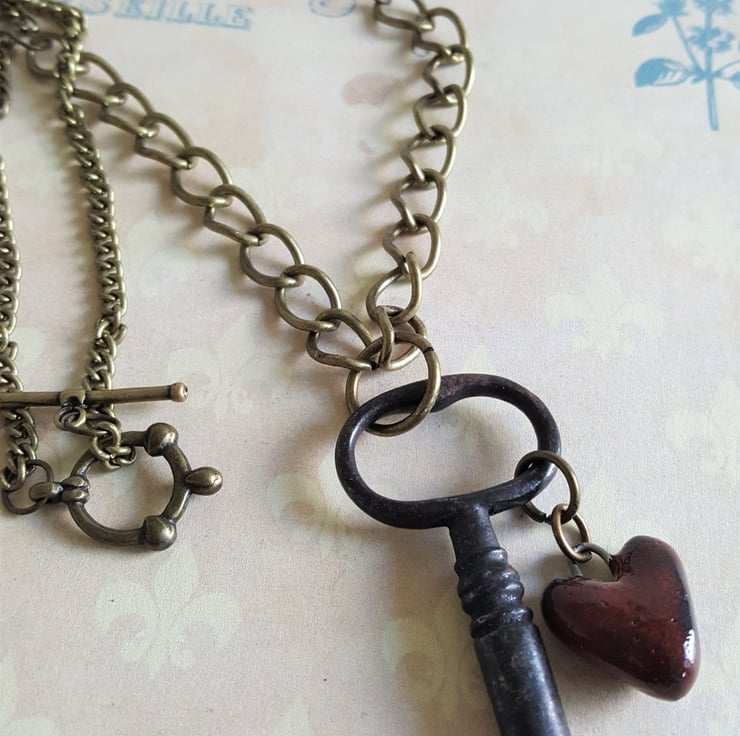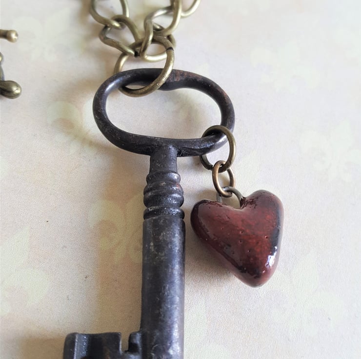 I have used a vintage key, I wonder what door it unlocked, and added a red glazed hand formed clay heart. To add further interest I have used two style of brass chain.