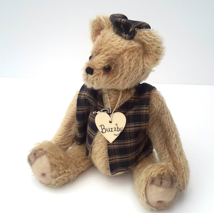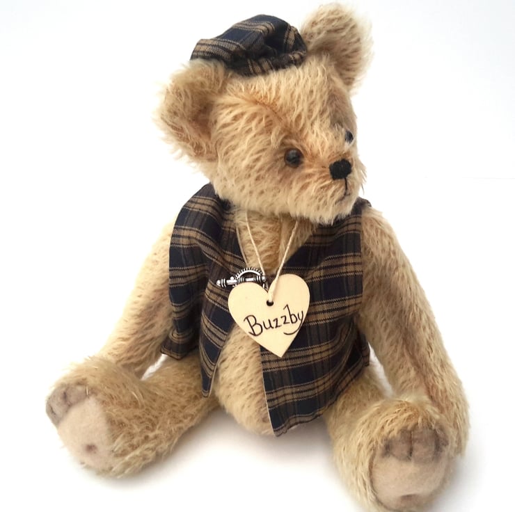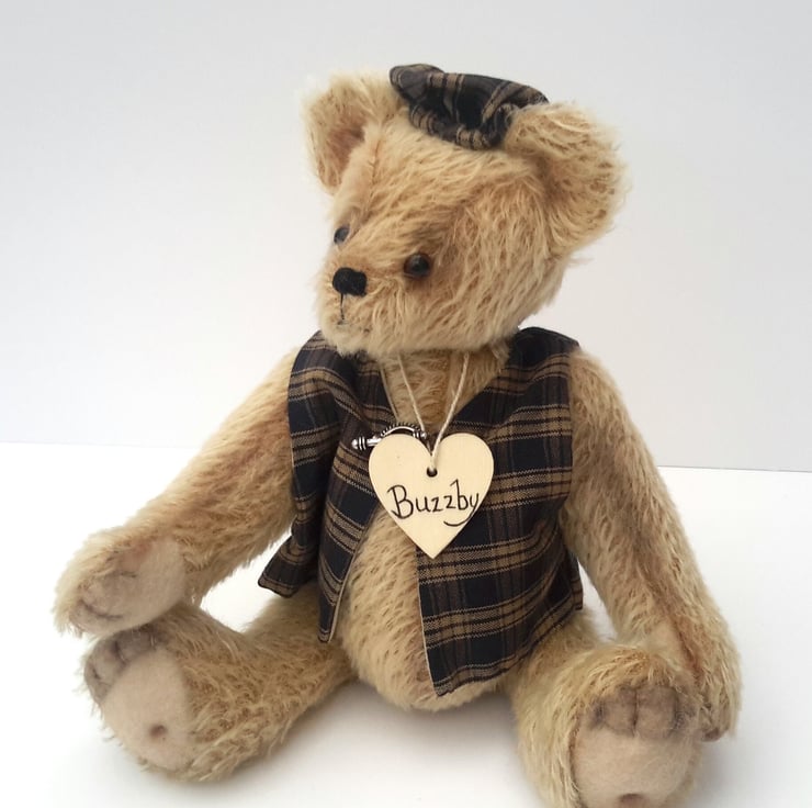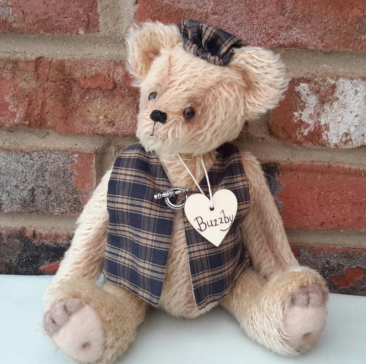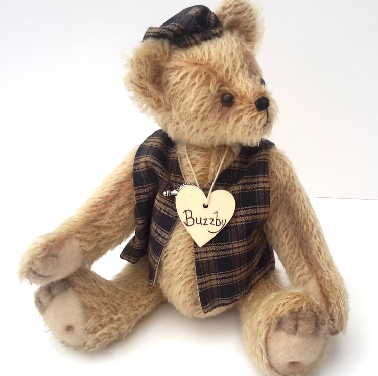 This is Buzzby, a bespoke, one of a kind collectable artist bear, handmade by Bearlescent. A smart, fully jointed, dressed, mohair bear.