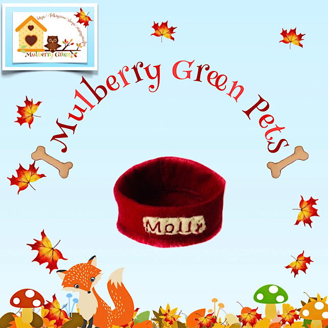A little red felt puppy bowl for Maisy’s puppy Molly, embroidered with her name.