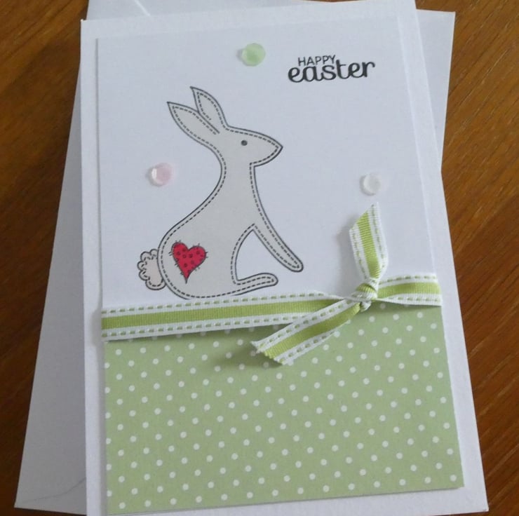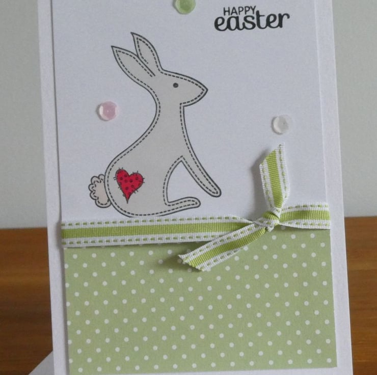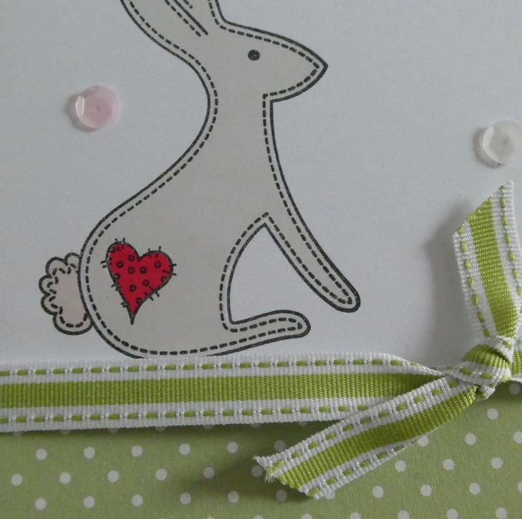 This card has been hand stamped with a cute rabbit sitting on a base of green polka dot card and coloured in soft grey, brown and with a bright red patchwork heart.