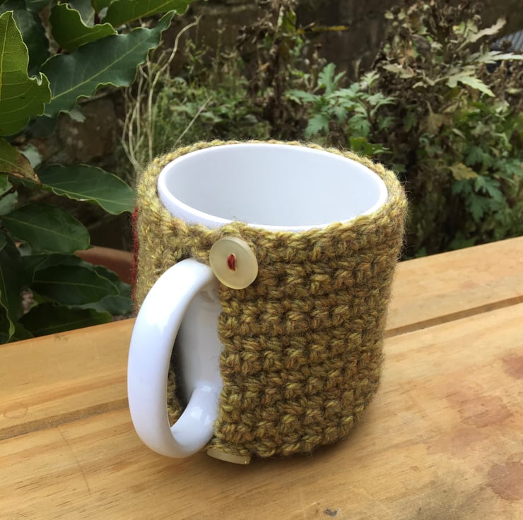 A rustic folk art mug cosy made using a lovely soft recycled yarn in a marled green colour.