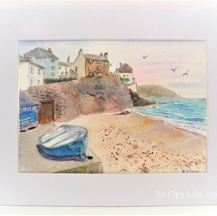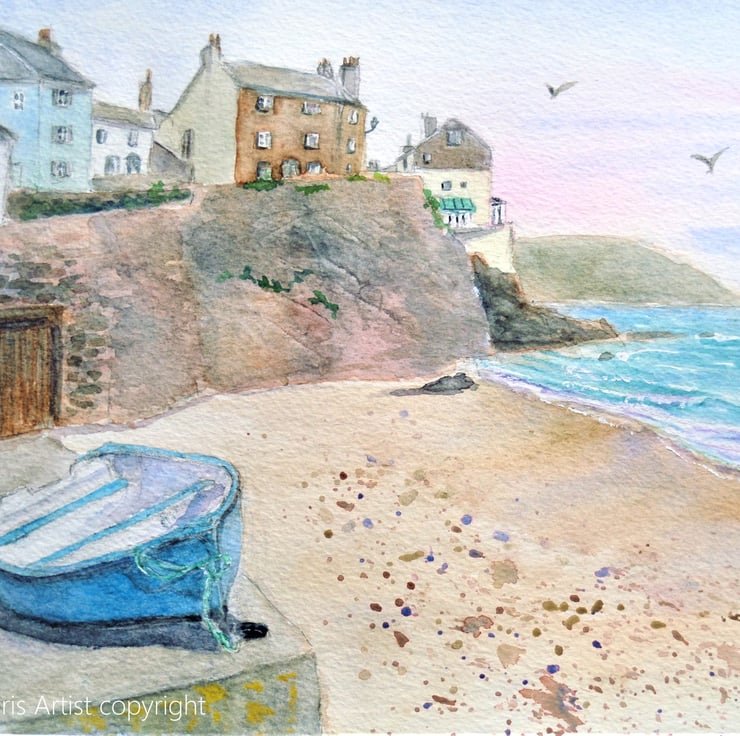 An original watercolour painting, from my own photograph. A view of the lovely Cawsand beach in Cornwall, based on my own photograph, taken from the slipway.