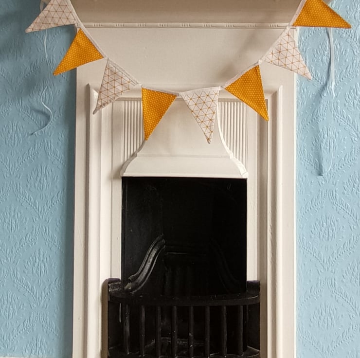 This bunting featuring gold and white spotted and geometric fabric will make an on trend decoration for any area of the home, or desk space. The double sided flags are perfect for windows or across the top of a doorway or arch as they can be viewed from both sides.