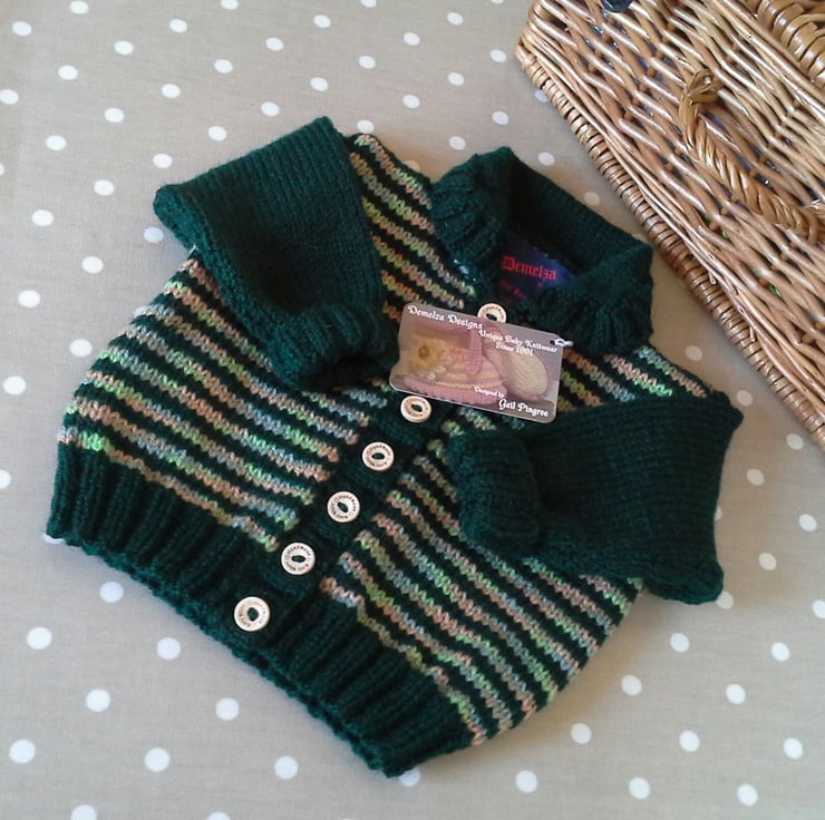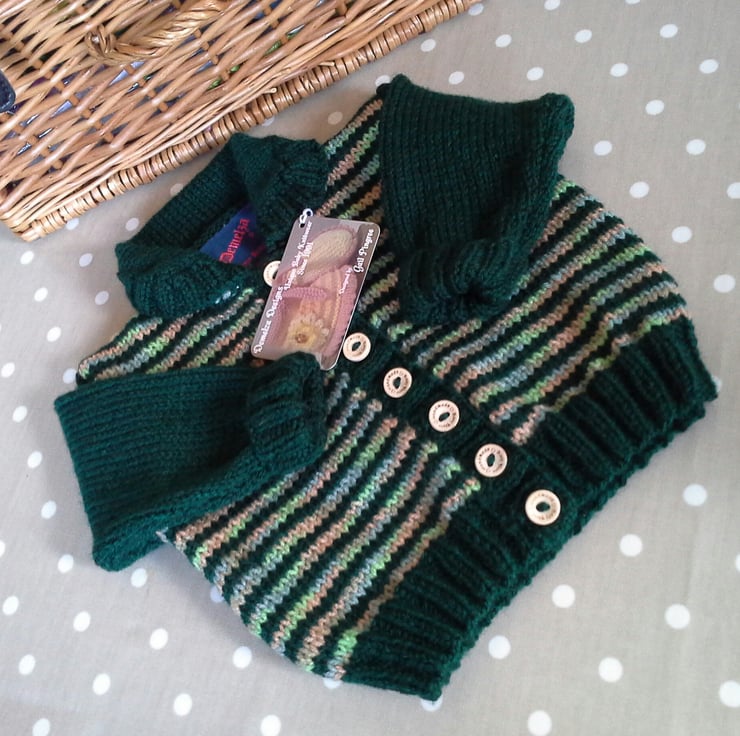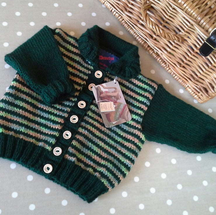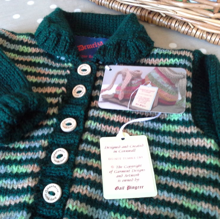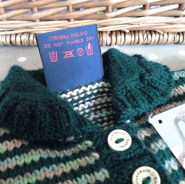 A very practical baby boy's cardigan designed and hand crafted in Cornwall using quality branded French and British manufactured machine washable yarns. The main colour is a deep british racing car green complimented with a multicoloured yarn. The buttons are made from genuine wood with a sweet sentiment burnt etched on them. The garment has the Demelza label attached to the back neck edge with the care instructions woven within it for lasting reference and proof of it's origins with the garment designer swing tag.