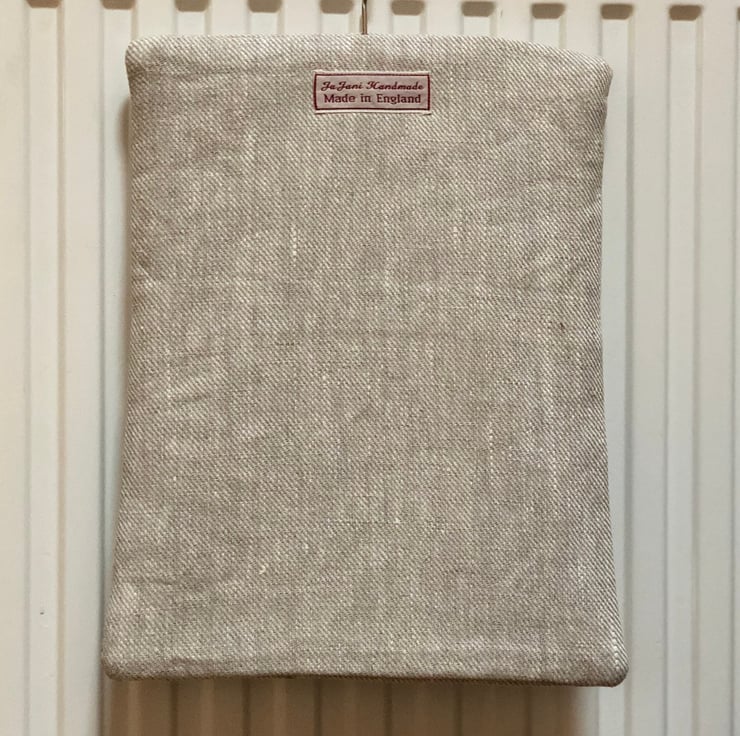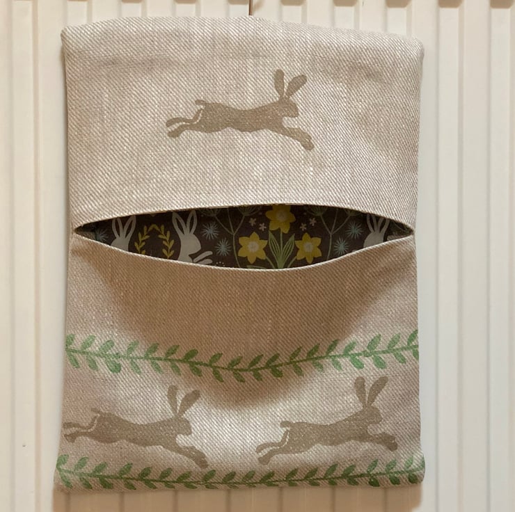 This attractive peg bag has been made from a quality linen fabric which I have block stamped with a typical countryside theme.Fully lined with a contrasting cotton fabric .Lining may differ from photo but iwill always compliment the peg bag.It hangs from a sturdy wooden coat hanger and the deep pocket will hold plenty of pegs.