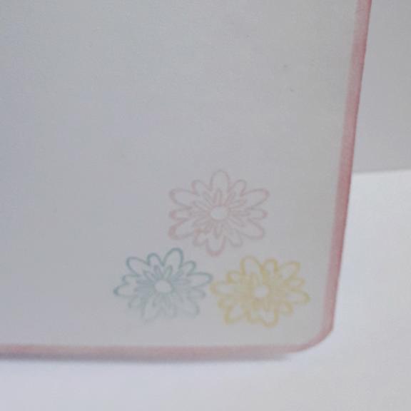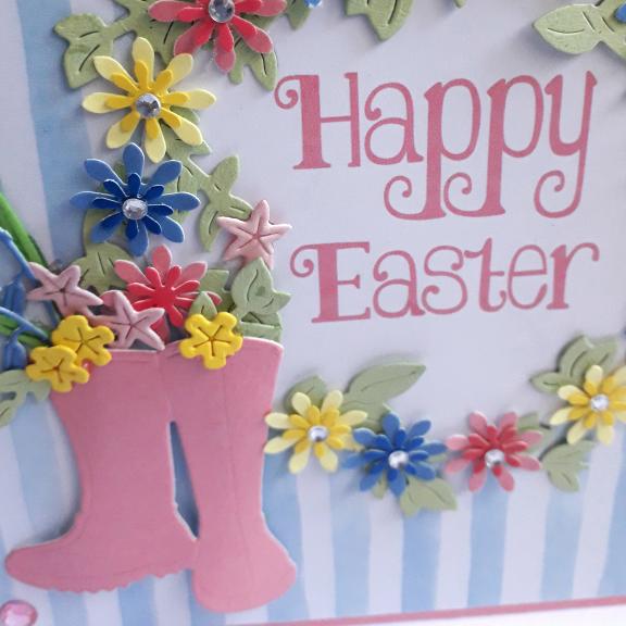 This card features a pretty floral wreath with blue, pink and yellow flowers, all finished with a clear gem in the centre, I have added a lemon yellow bird to the top right side and a pair of pink wellingtons with flowers spilling over the tops, to the bottom left, The blue stripe background is on a pink card layer, then a white base card, which is 15cm/6" square, the blank white insert is edged with pink ink and has 3 flowers stamped in the bottom right corner, the envelope is white.