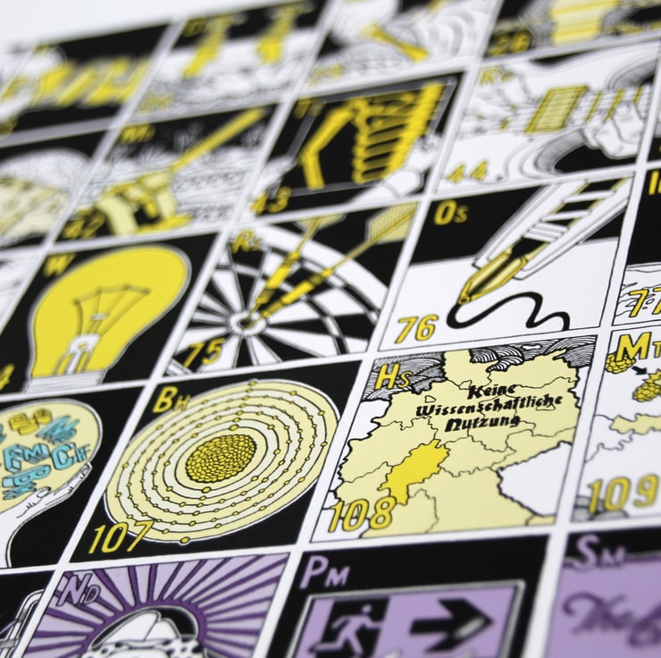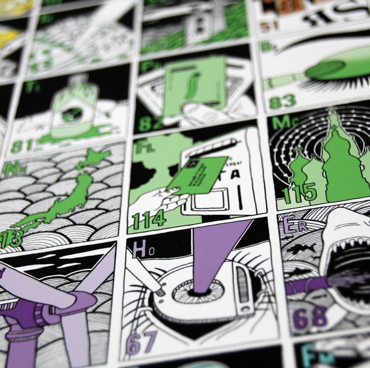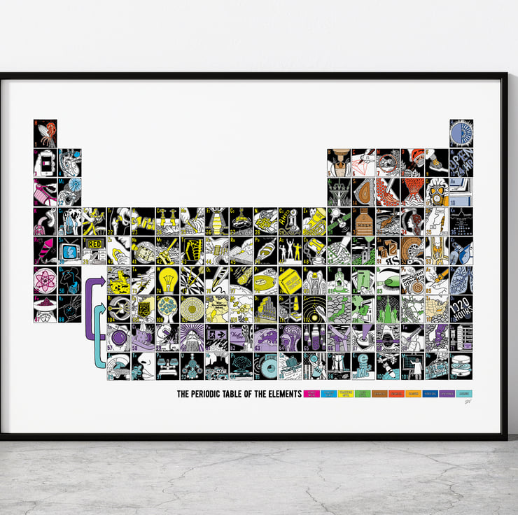 A self initiated project of the illustrator and designer James Nicholls, the print is designed to show the scientific and everyday uses of all 118 elements in the periodic table as an educational and entertaining piece of wall art, in a more engaging way than a standard periodic table. Every element has been hand drawn by the artist over the course of 3 year, and then combined into this high quality digital Giclee print. Each drawing shows the atomic number, the symbol, and with the use of colour the group that the element falls into.
