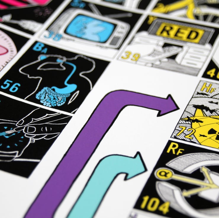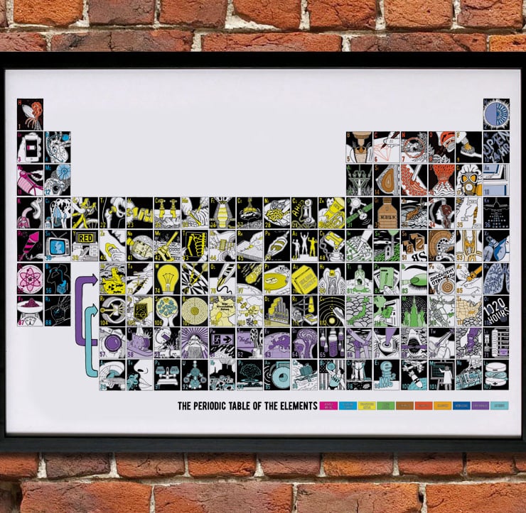 A self initiated project of the illustrator and designer James Nicholls, the print is designed to show the scientific and everyday uses of all 118 elements in the periodic table as an educational and entertaining piece of wall art, in a more engaging way than a standard periodic table. Every element has been hand drawn by the artist over the course of 3 year, and then combined into this high quality digital Giclee print. Each drawing shows the atomic number, the symbol, and with the use of colour the group that the element falls into.