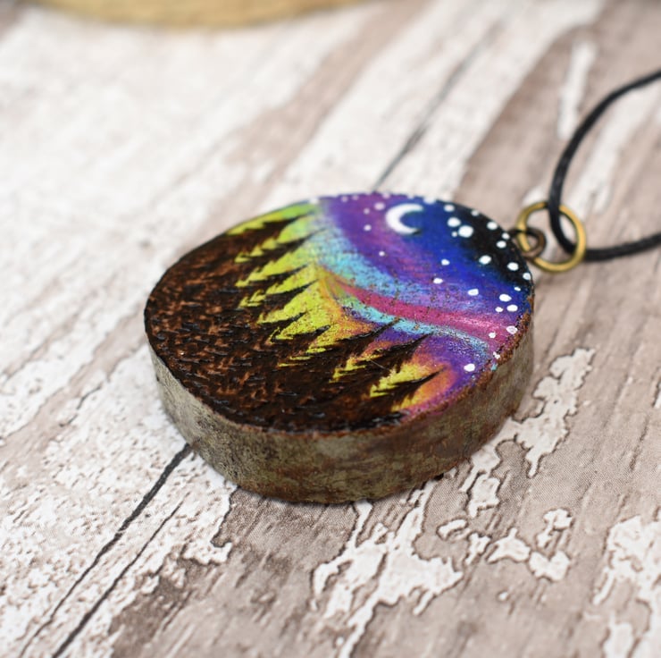 A forest or woodland themed wood slice, with a treescape silhouette hand burned into this branch piece using pyrography and then the sky is brightly coloured with prismacolor pencils. This is a chunky wood slice piece. A great idea for a five year wood anniversary gift.