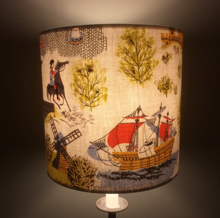 Fun 50s 60s Castle , Ships, Windmill , Horses Vintage Fabric Lampshade option - an unusual feature fabric for a lampshade in a modern country or vintage styled home. Great for a nursery , playroom or childs room in particular .