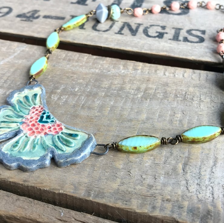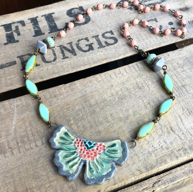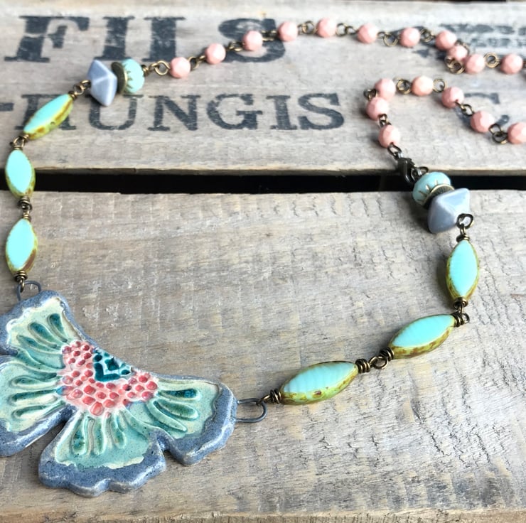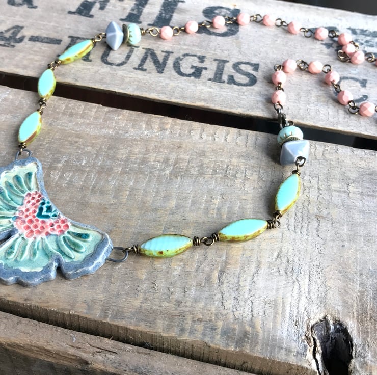 The necklace is finished with a mix of beads, carefully chosen to match the colours in the pendant. These include mint green Czech glass spindles, dusty grey Greek ceramic oxyhedron beads and matte coral-peach fire-polished rounds.