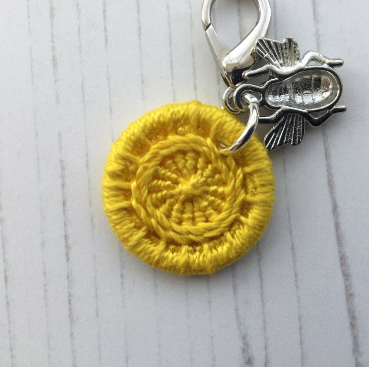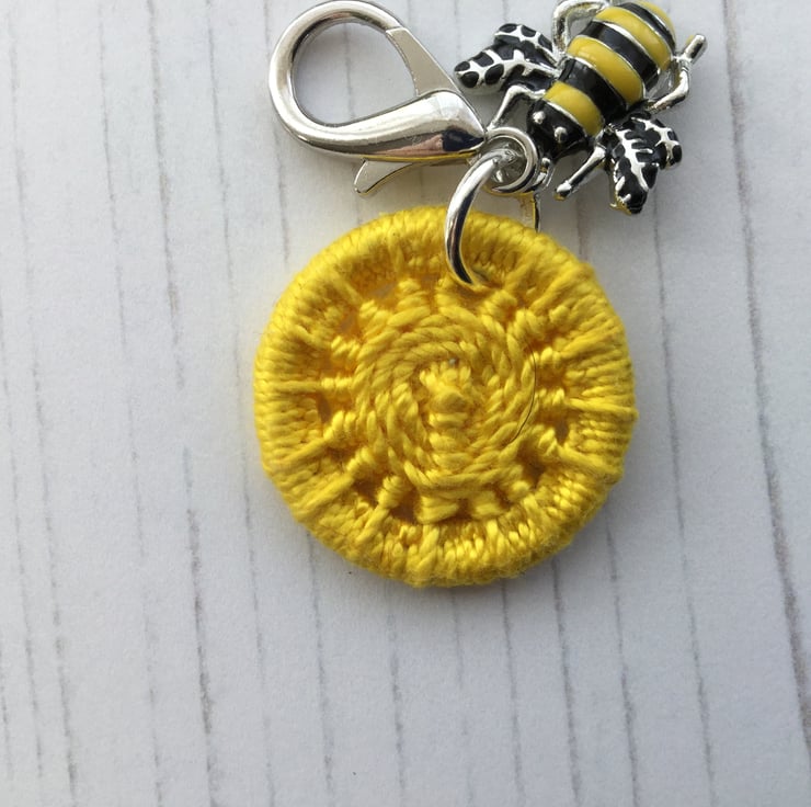 The button is fastened together with a cute metal enamel bee charm onto a lobster claw catch to enable it to be fastened easily to a zipper pull or spiral binding.