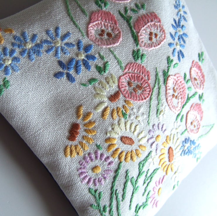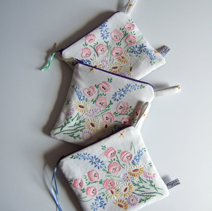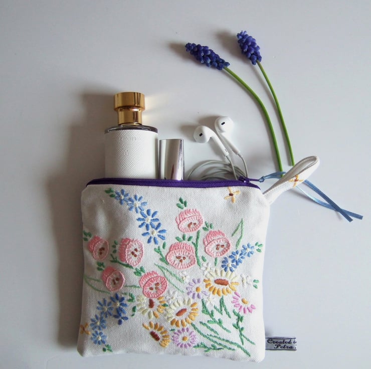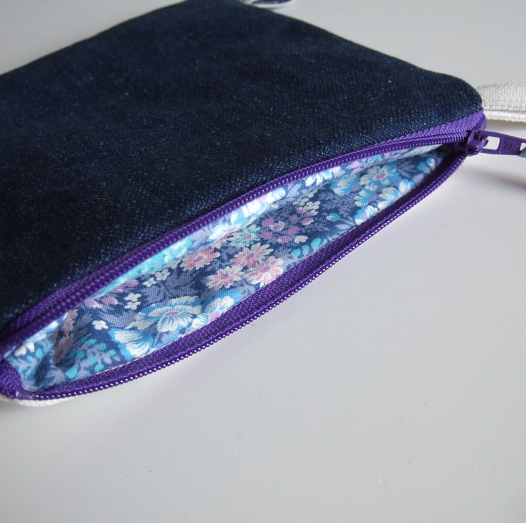 The embroidery has been stitched onto cotton to strengthen it, but it is still soft, whilst the back is made from blue denim to give it some edge. It opens with a 16 cm bright purple zip, and is lined with a pastel vintage floral cotton. It is finished with my own embroidered name tag.