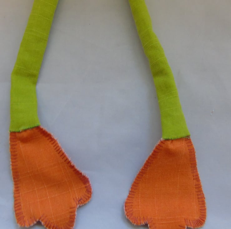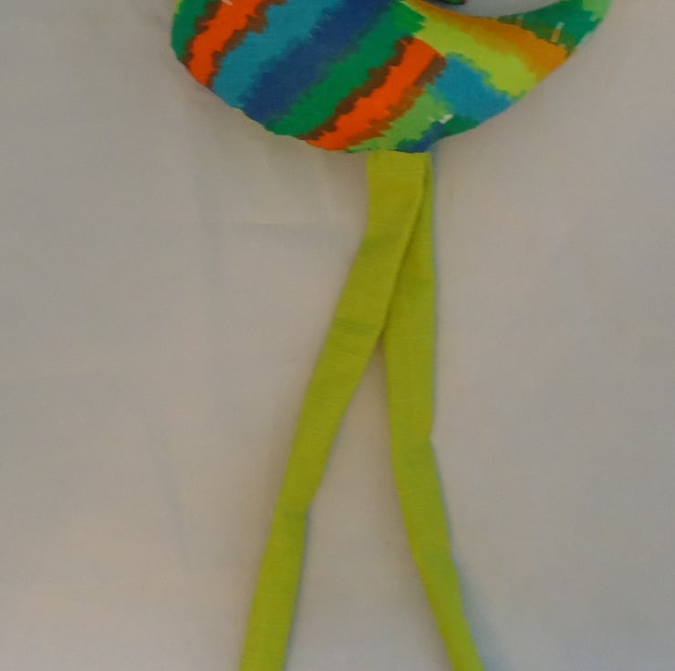This hanging stork is made from a gorgeous, bright vintage fabric in greens and blues. This fabric is complimented with long green dangling legs and orange beak. The positioning of the easily adjustable cord means that this stork/bird looks great hanging from a ceiling or wall. The eyes are felt and are securely fastened to the body
