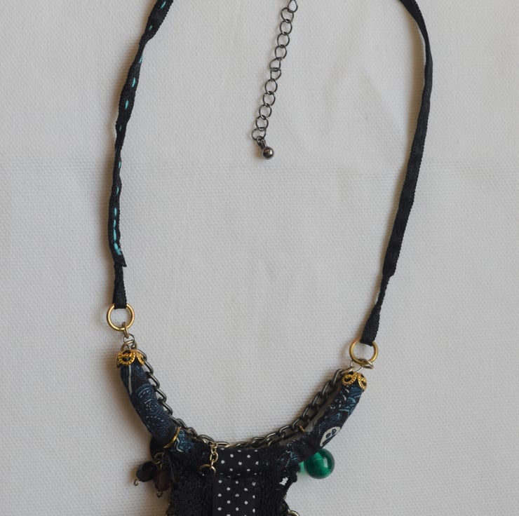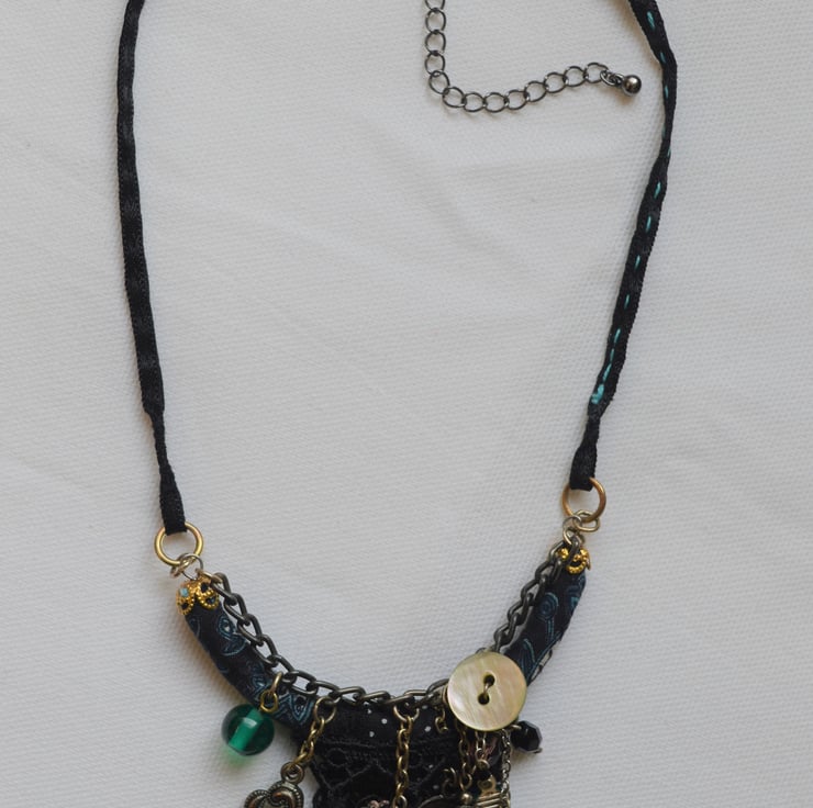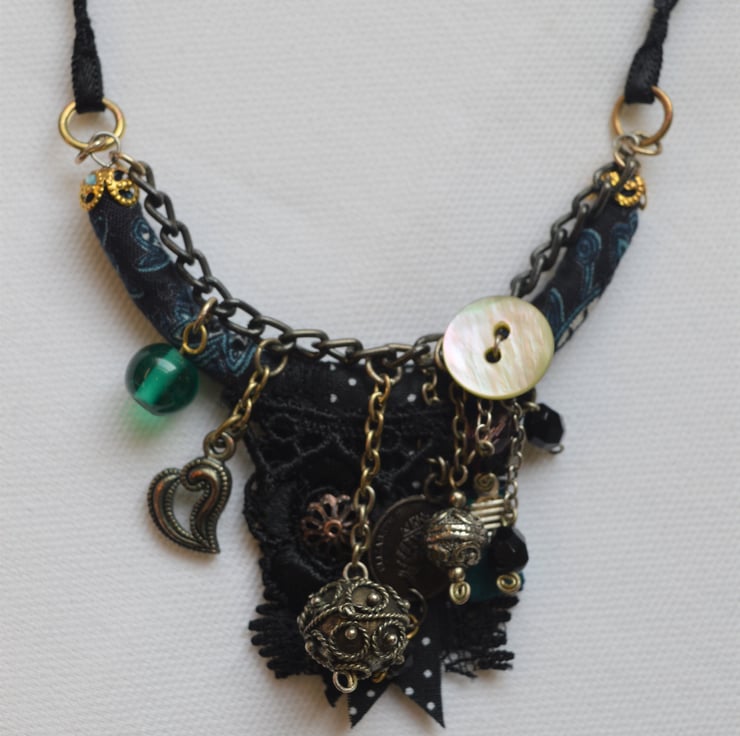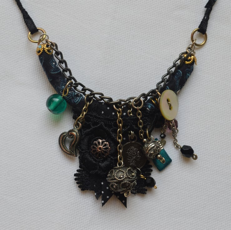 This necklace has been created using ribbons, braids, guipure lace, dark blue paisley fabric and embellished with various glass and metal beads, charms and components.