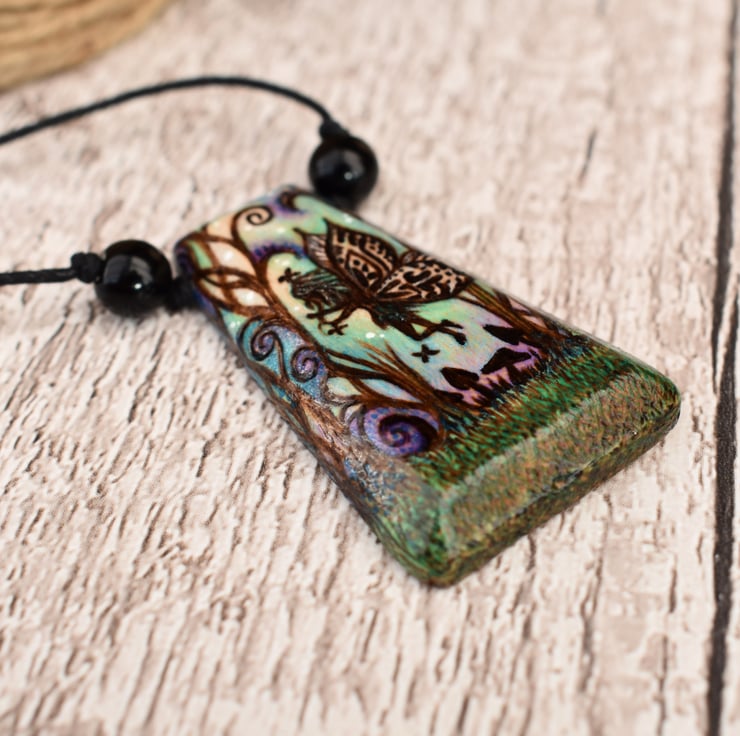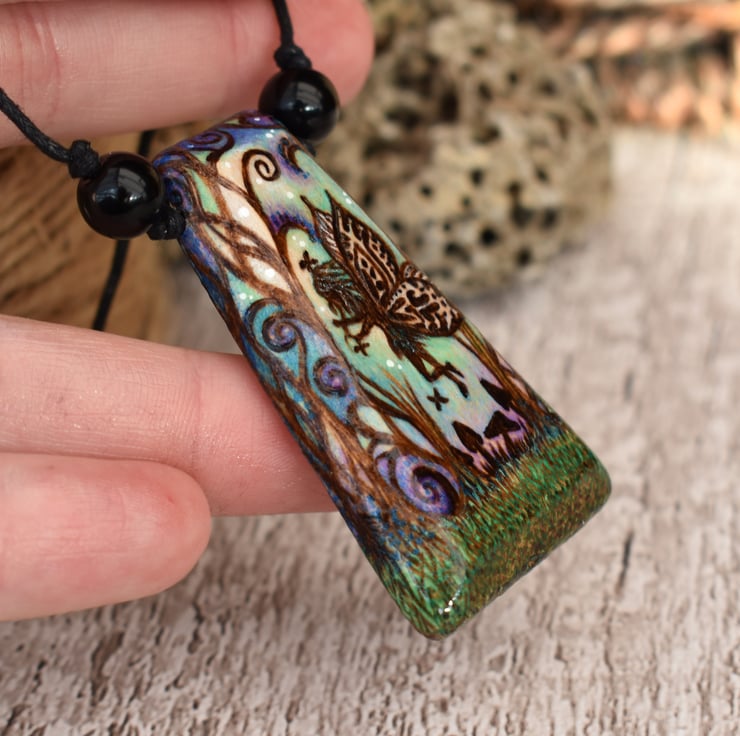 This fairy silhouette pendant has been decorated by hand using pyrography, and coloured using intense prismacolor pencils. It features a fairy in a garden of tall grass and tiny mushrooms. It would make a great birthday or wood anniversary gift.