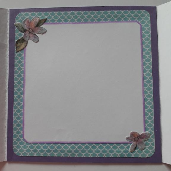 A split front card with a cute glittered bird on a blossom tree branch, the flowers are also glittered, this is on a blue patterned background then purple card, on the other side I have placed a die cut floral flourish topped with a double bow, there are purple gems in all the corners. Inside is a blank white panel edged with purple ink, with flowers in opposite corners.