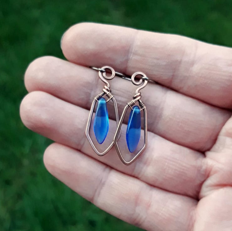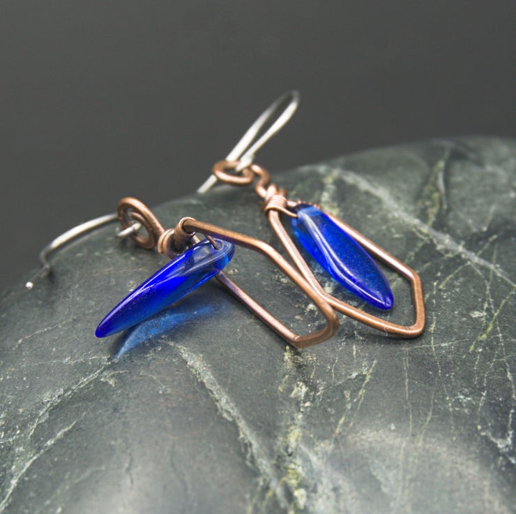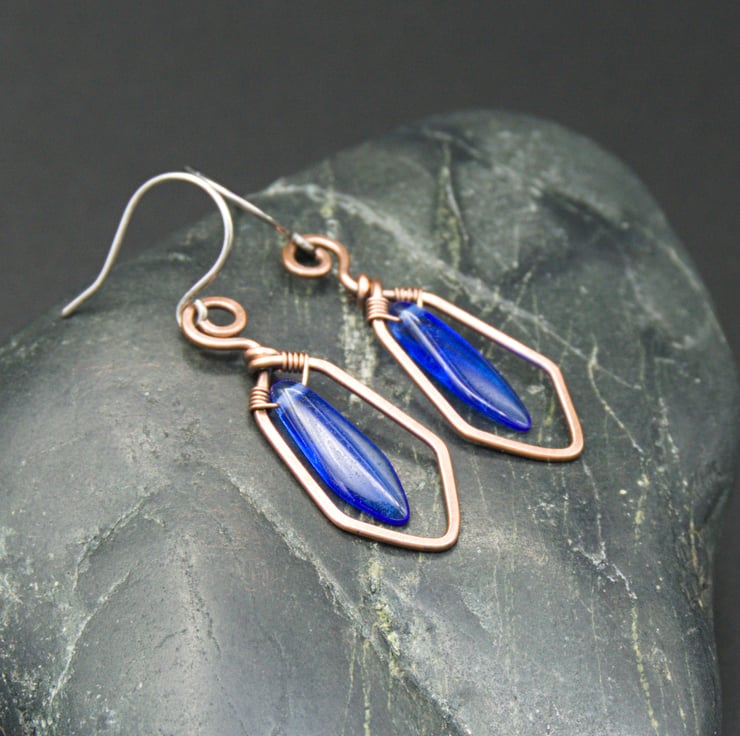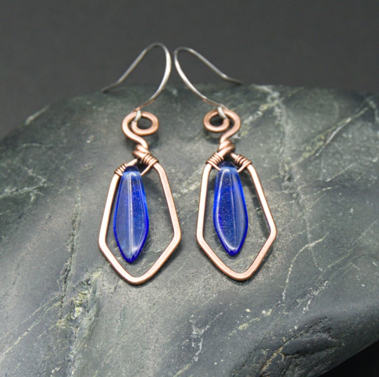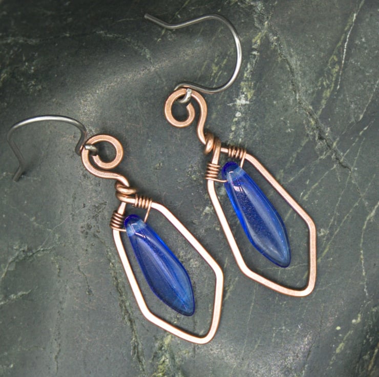 These striking earrings feature gorgeous blue glass dagger beads. I've formed frames for the beads using copper wire, which I've hammered flat. The beads are attached with fine wire so that they hang & move within the frame. The tops are finished with hammered spirals, which attach to the handmade niobium hooks. Niobium is an unalloyed metal which is great for those with a metal sensitivity.