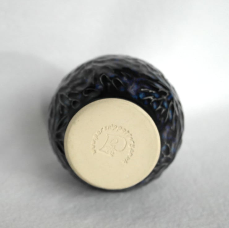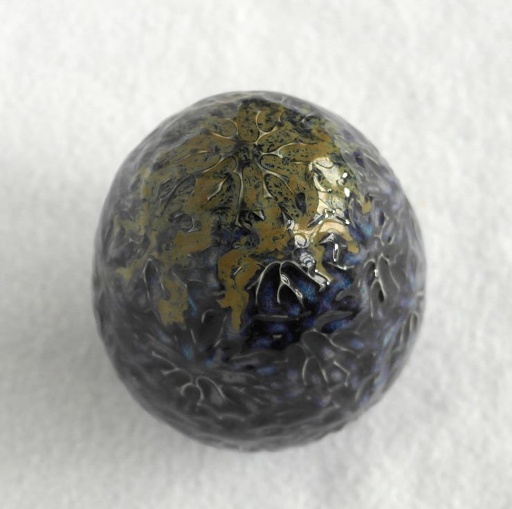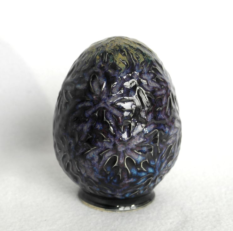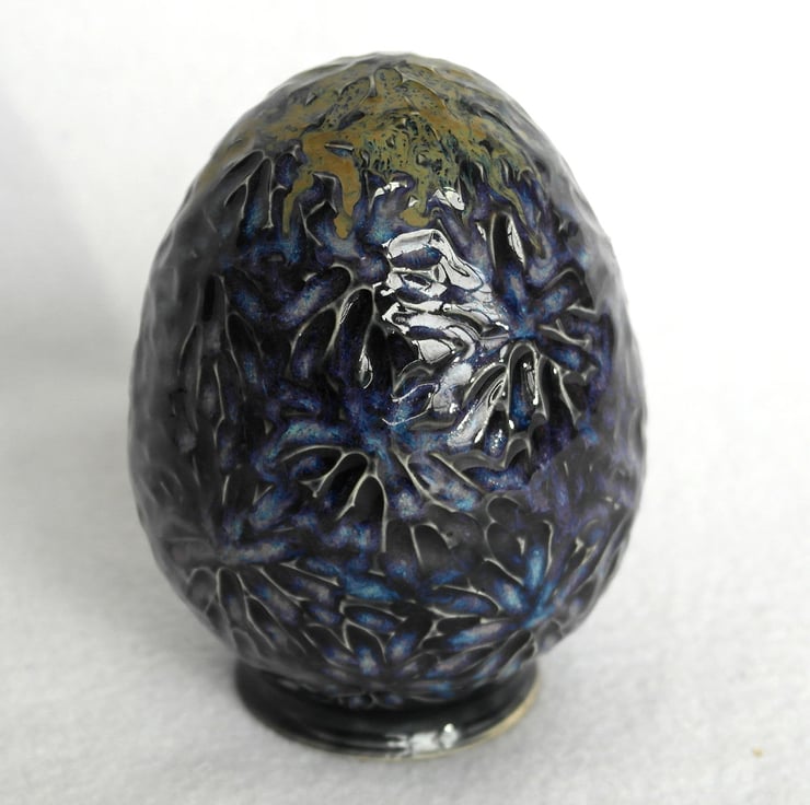 12cm tall textured dragon's egg, thrown in stoneware on the pottery wheel. This egg is hollow and decorated with black, purple and blue glaze, with green on the top.