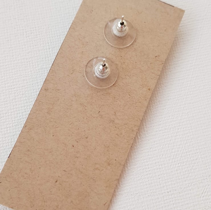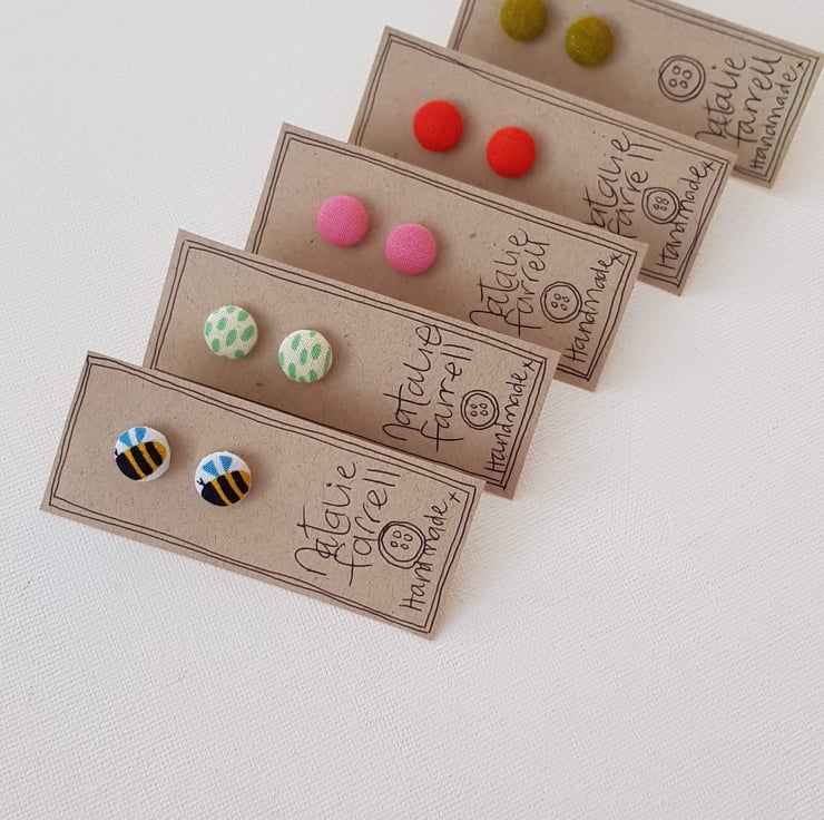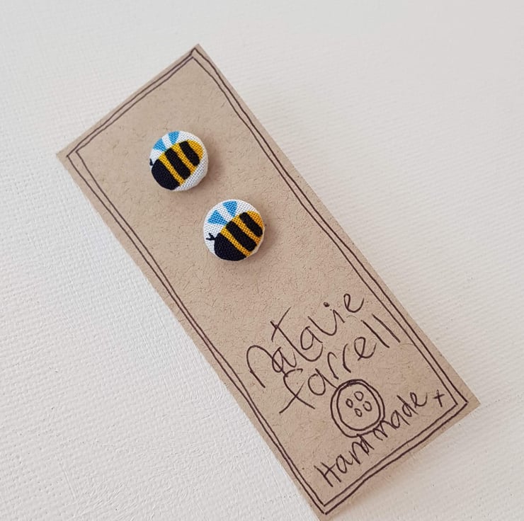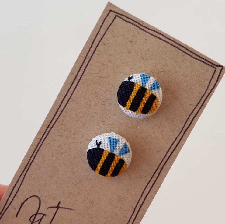 11mm Nickel free covered button earrings, bumble bee print in black, yellow and turquoise.