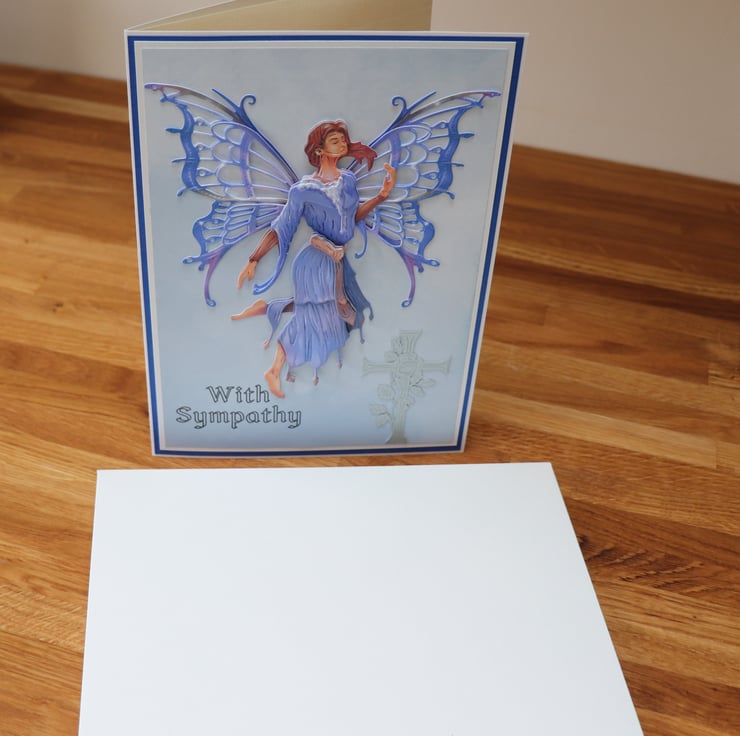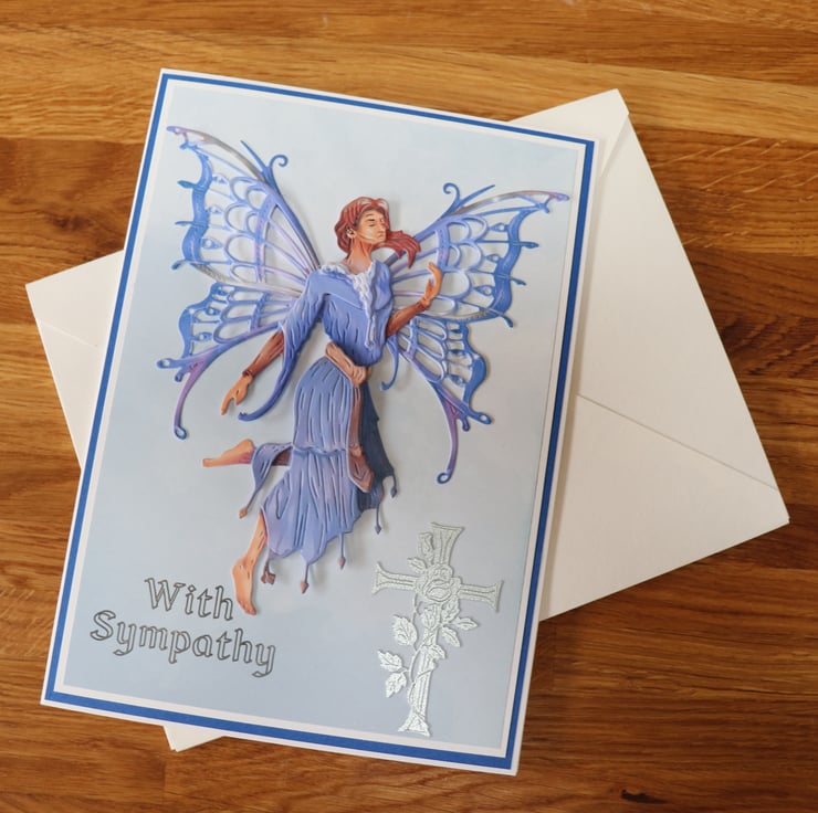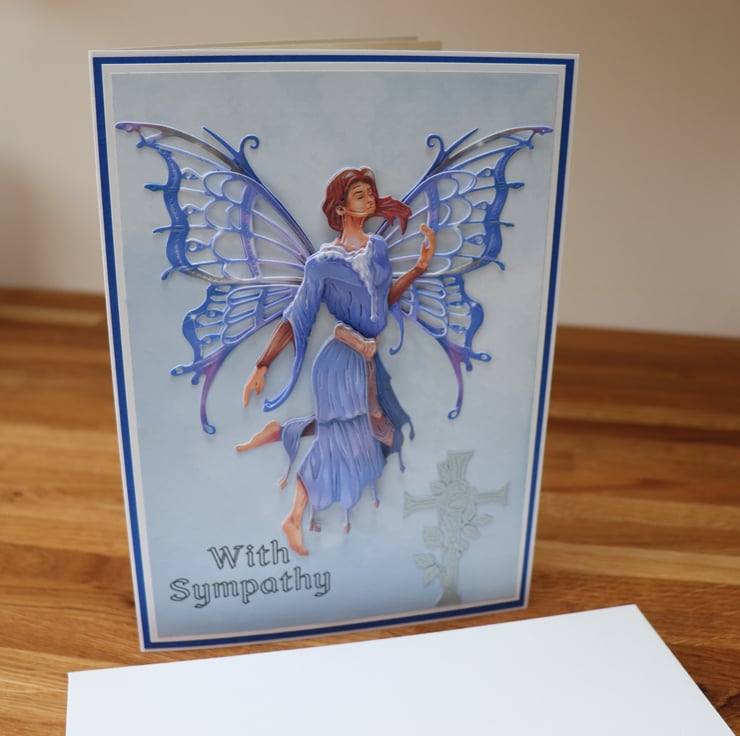 The angel and her butterfly wings are all decoupaged, and there is a cross with a rose wrapped around it in silver.
