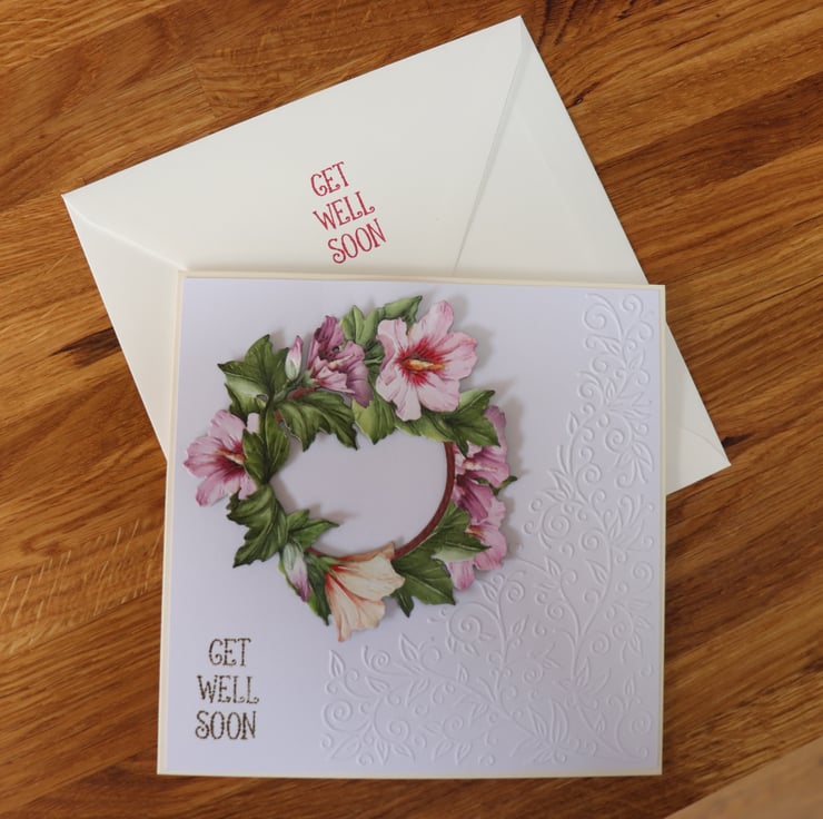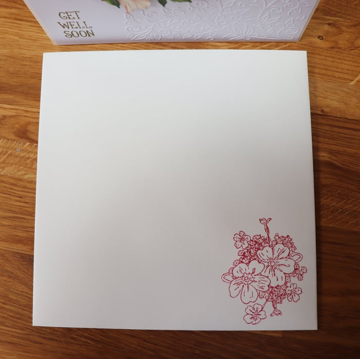 This card is 6x6 in size and has get well soon on both the front and inside the card, the envelope has the same sentiment on the envelope flap and flowers on the back.