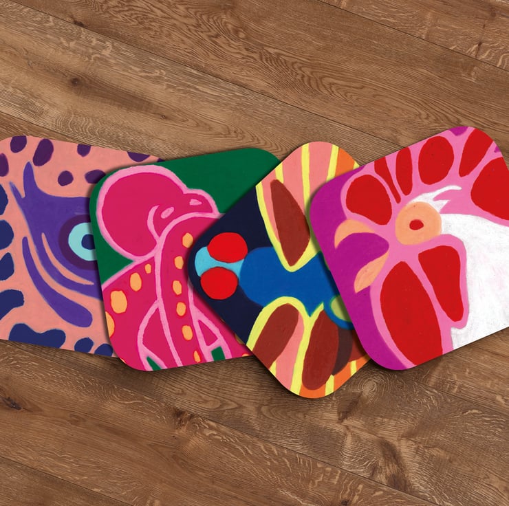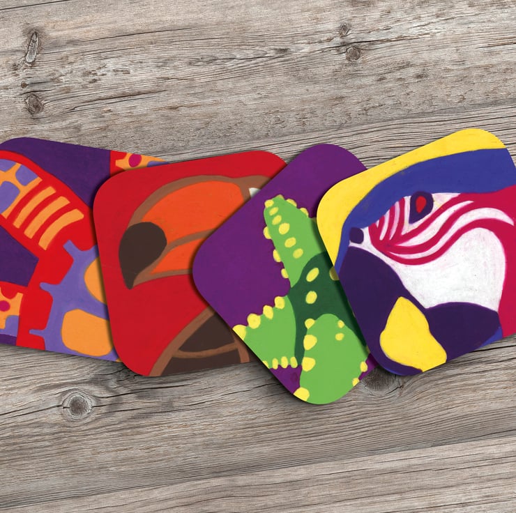 Set of 2, 4, or 8 high quality coasters depicting a selection of animal oil pastel illustrations from my self initiated illustrated 36 Species project - depicting the Octopus, Parrot, Turtle, Chicken, Dragonfly, Cheetah, Starfish and Toucan. The series depicts the animals in a bright and colourful pop art style, where the colours are not indicative of the real life colours, thus some animals are more obvious than others and many require interpretation and imagination.