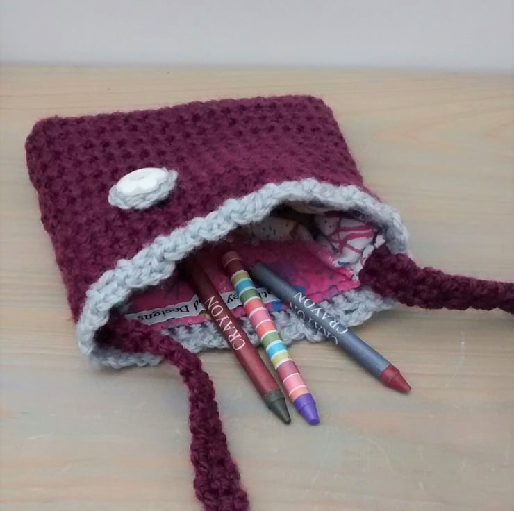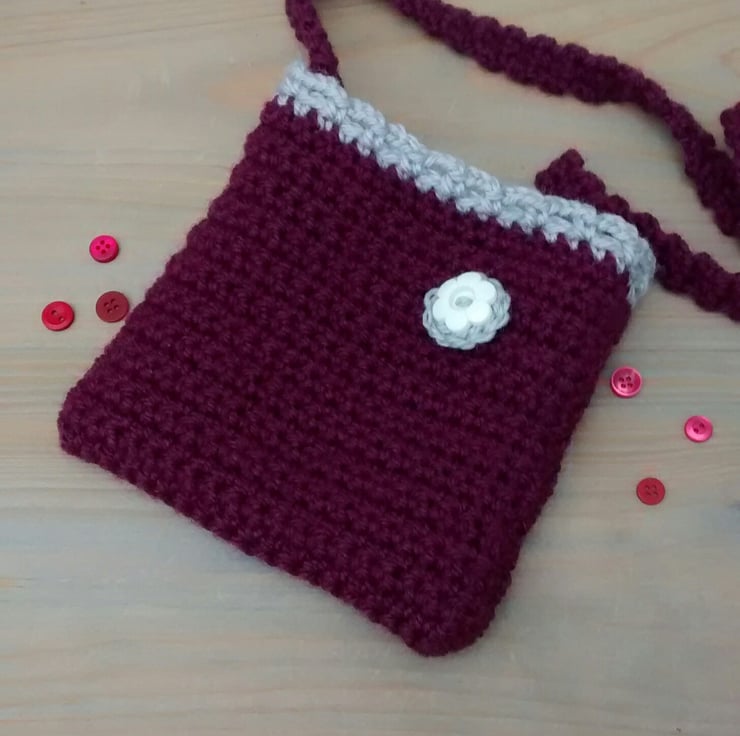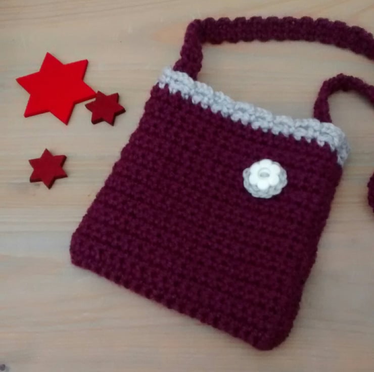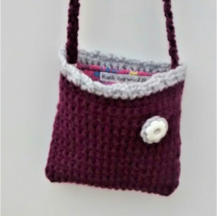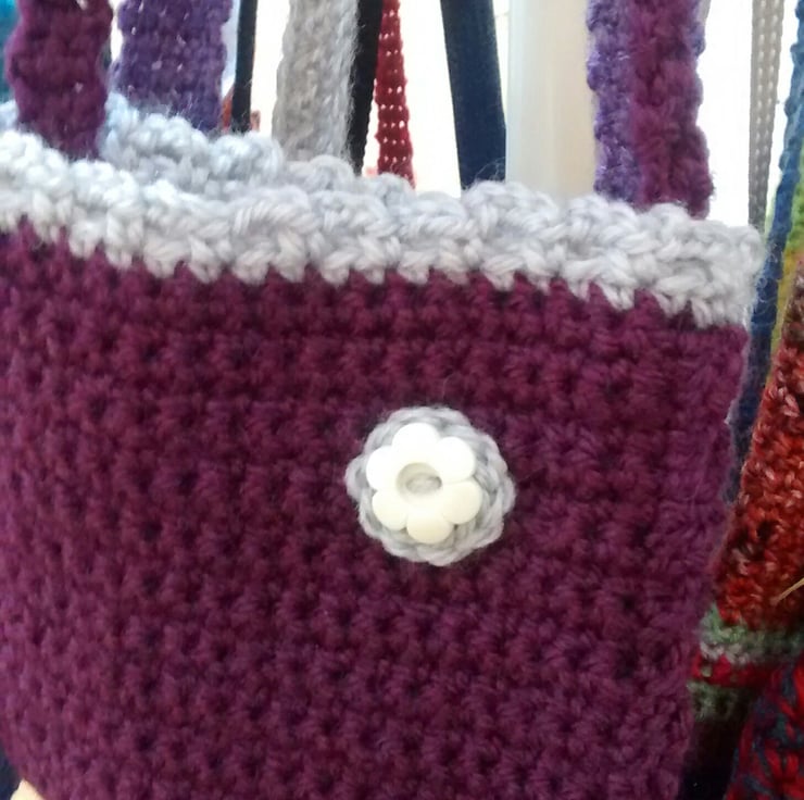 This pretty bag is my own design. Handmade using a plum wool blend with a contrasting light grey edging and flower detail. A crochet flower has been stitched on to the bag for added cuteness. An upcycled button has been sewn to the flower centre.