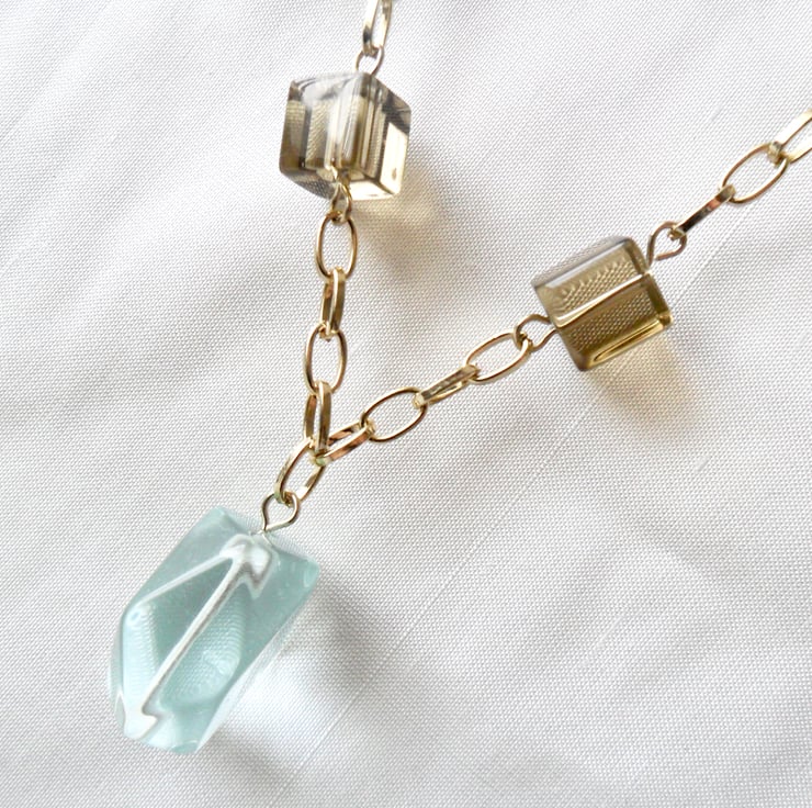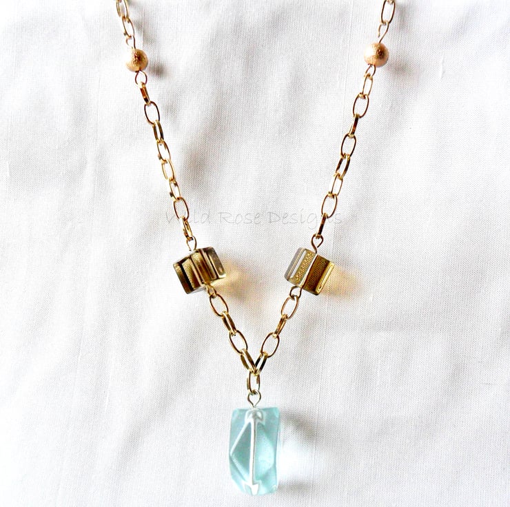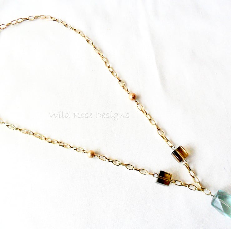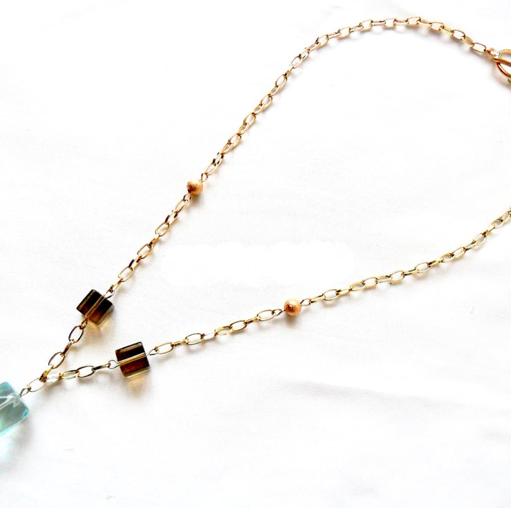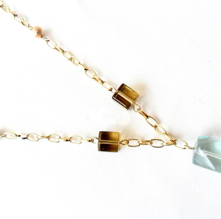 A Champagne coloured chain necklace with a large Aqua glass bead at the centre. There are also two smoky brown glass cubes and two small champagne coloured glitter beads. The necklace fastens with a toggle clasp and measures 49 cm (19 1/4") long including the clasp.
