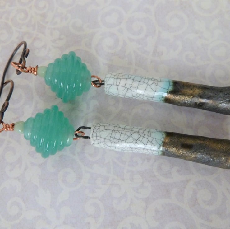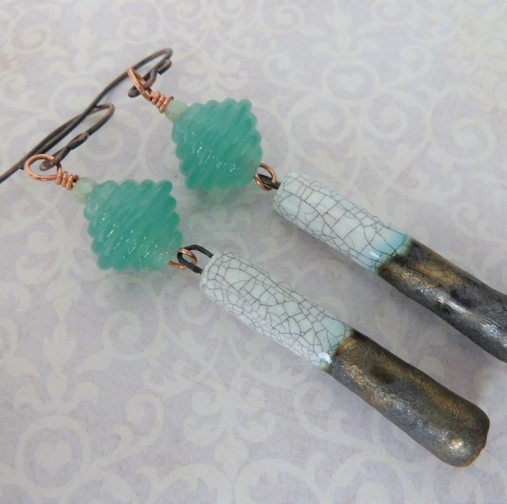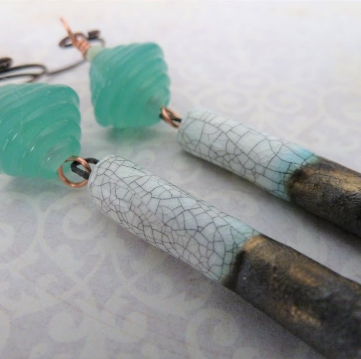 A pair of earrings made with handmade copper ear wires, handmade lampwork green glass beads and handmade ceramic droppers.